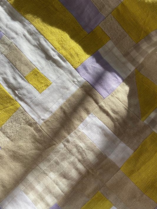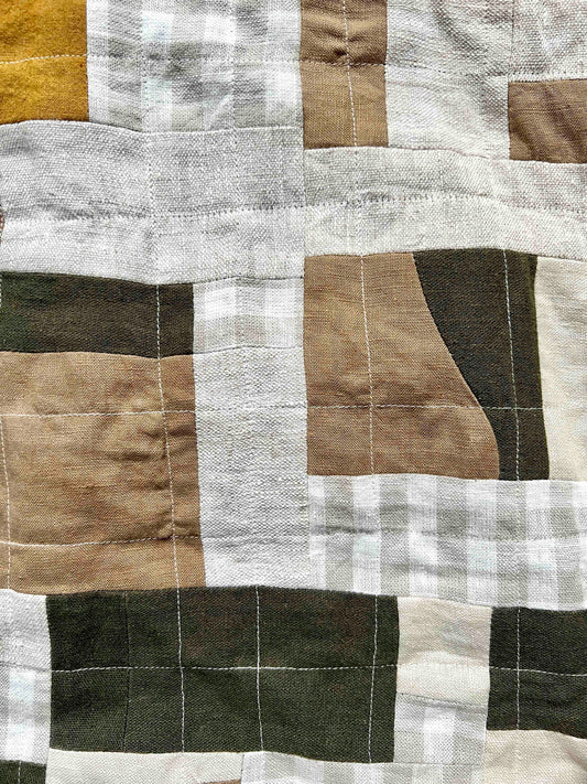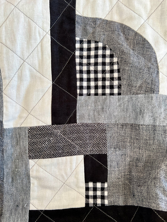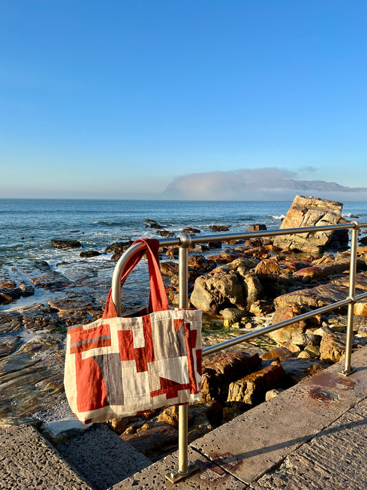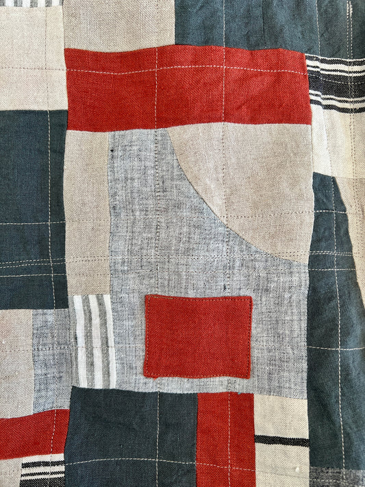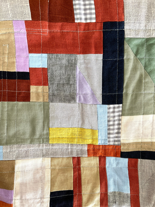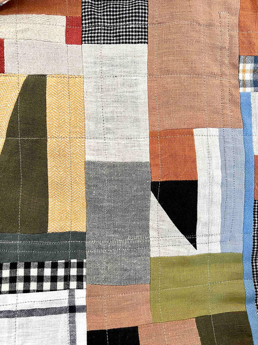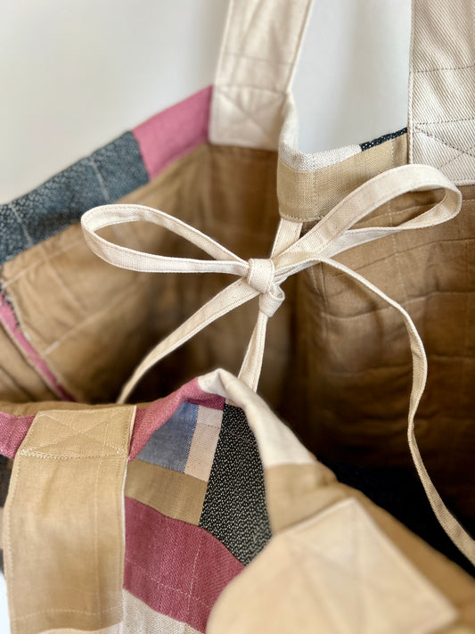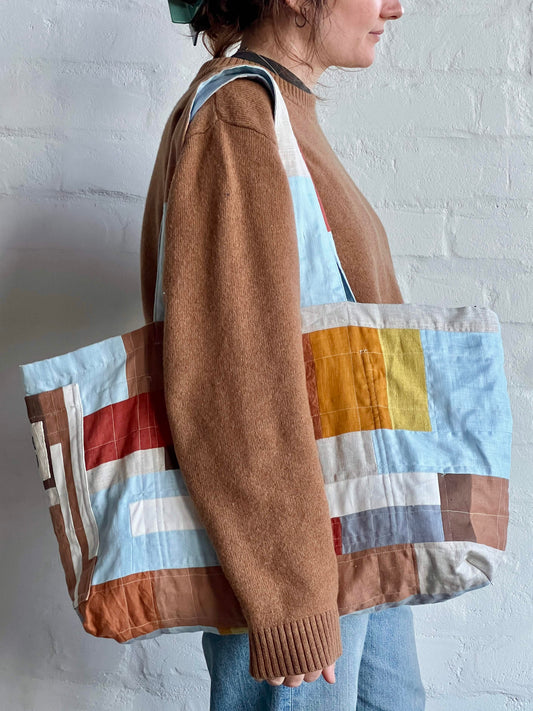 Each bag is made entirely from scrap fabric I receive from various local dressmakers and mills and is therefore completely unique. I carefully sort, wash and organise the scraps before I start. I then create a composition and sew pieces together, slowly building it up until it’s the right size, and do the same for the lining. I often try and use the fabric scraps in their original state - I find this often leads to more interesting shapes and structures.