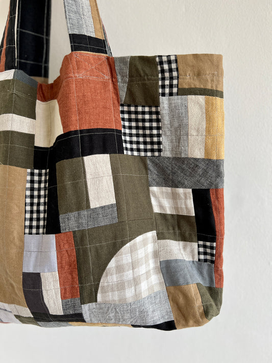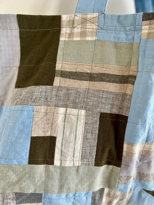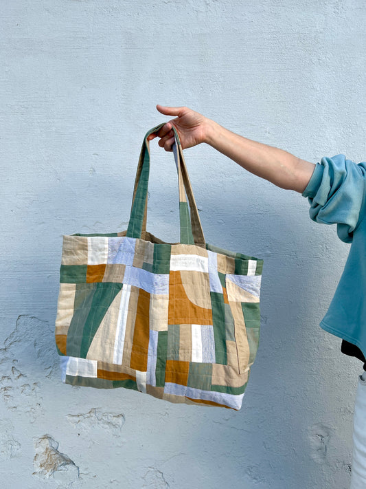 My mom asked me to make her a patchwork tote bag four years ago from our old family clothing… Ever since I made that first one I’ve been on a quest to make *the* perfect tote bag, and I think this design is pretty darn close.