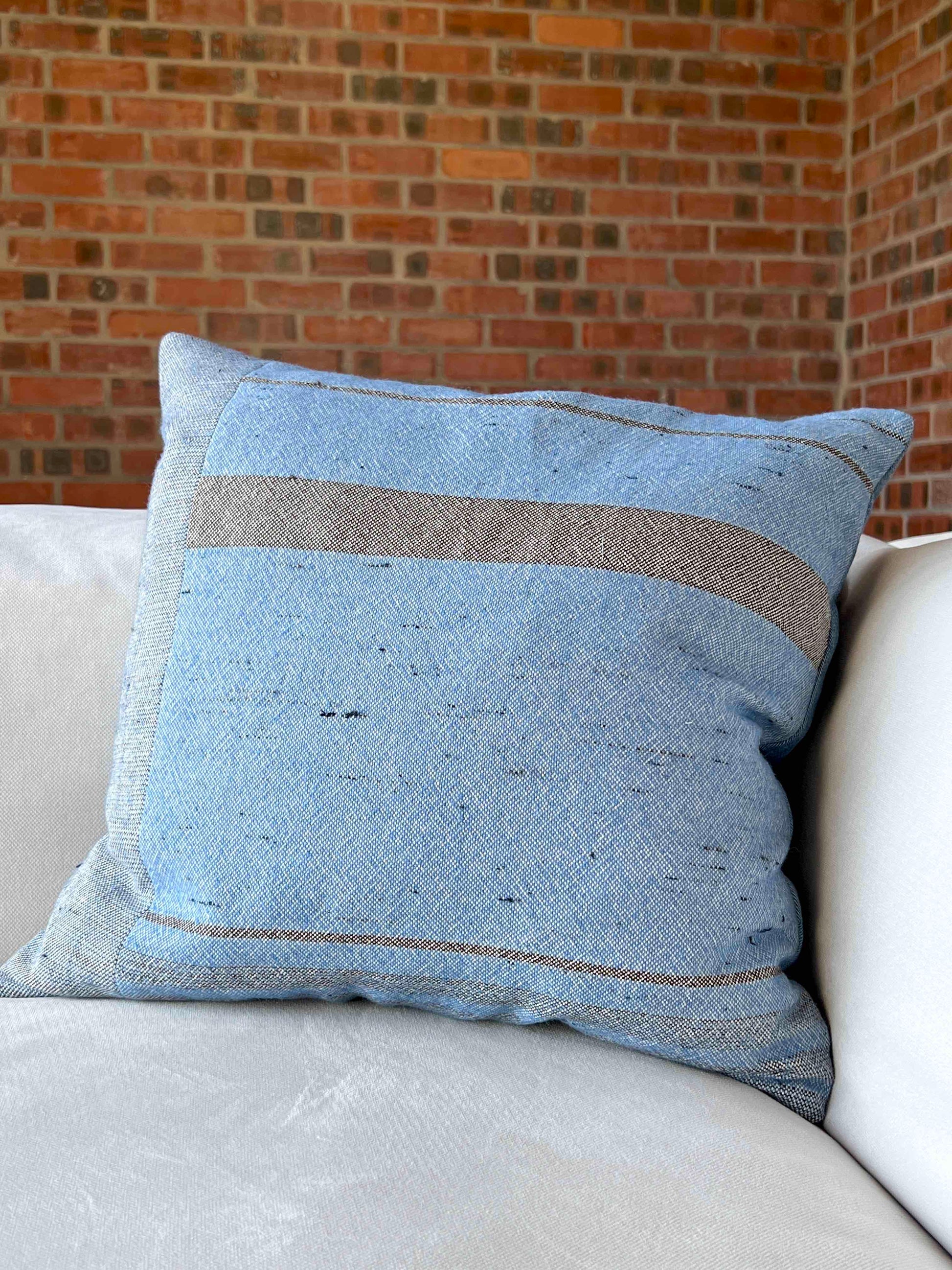 Patchwork cushion with denim scraps hand quilted with cotton sashiko thread onto a cotton backing (from a repurposed sheet).