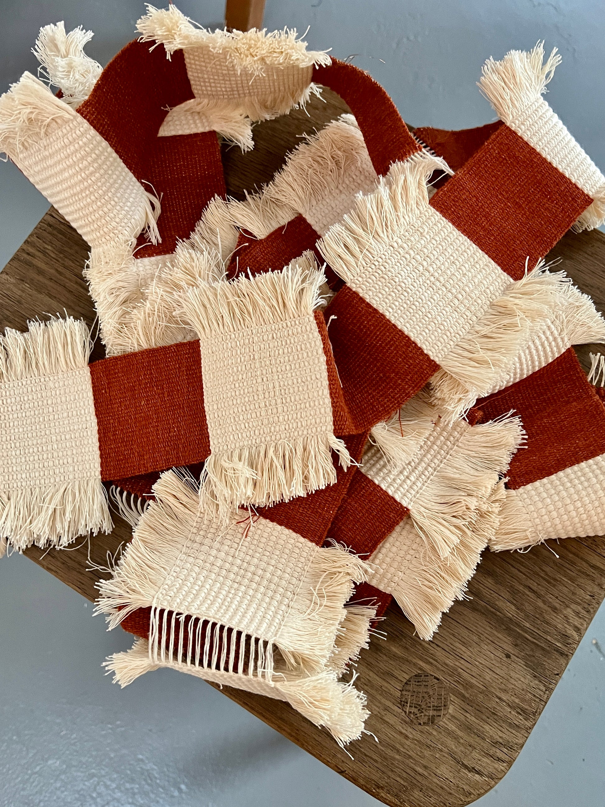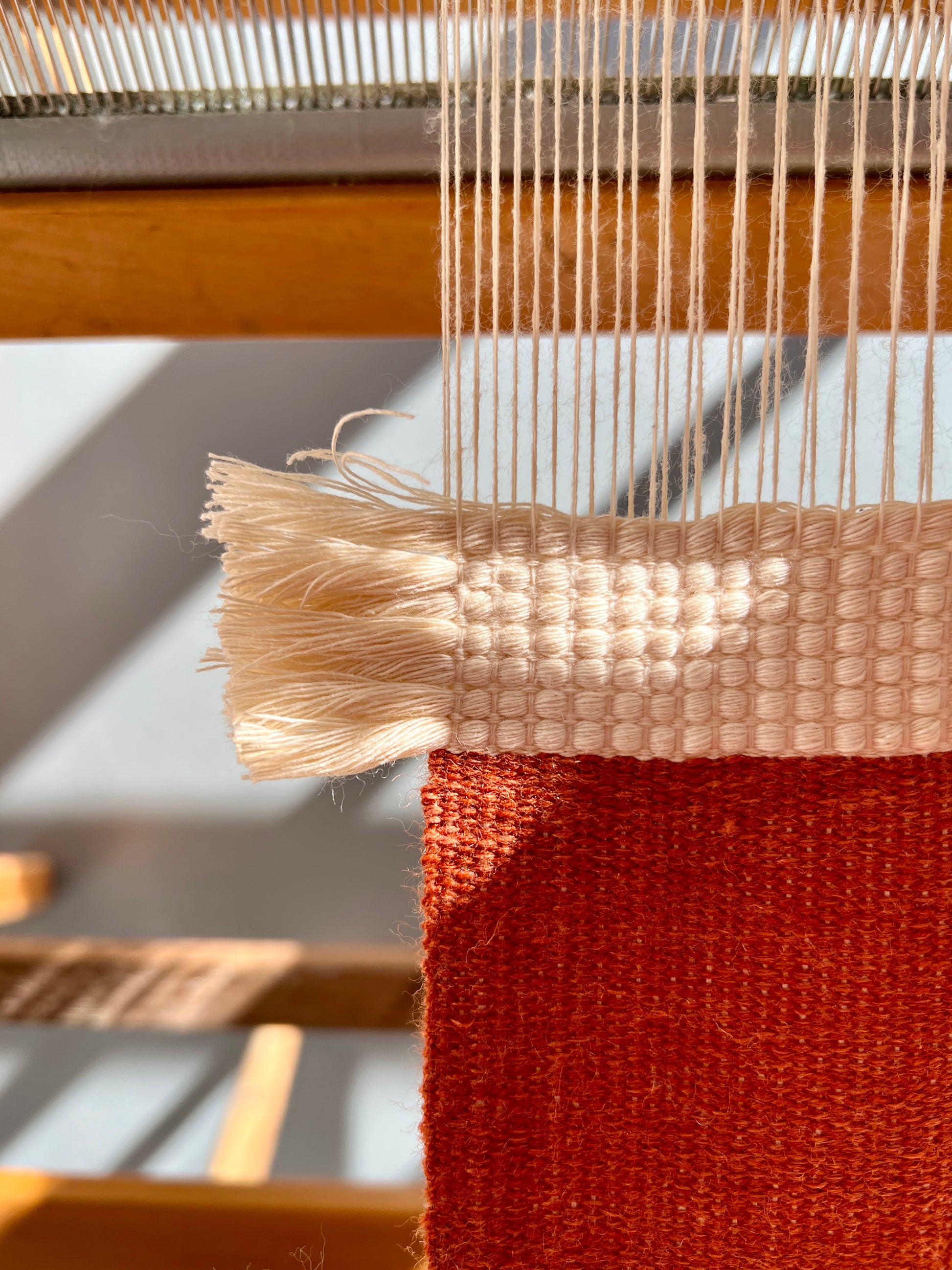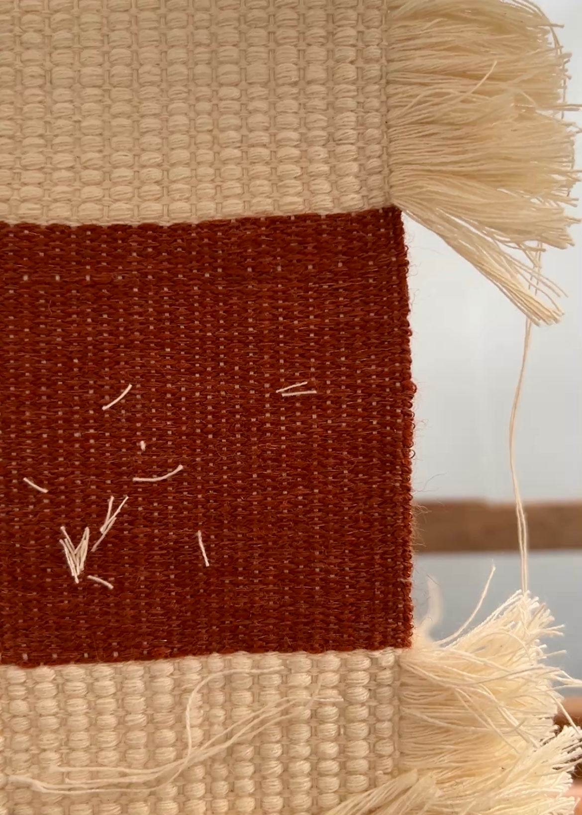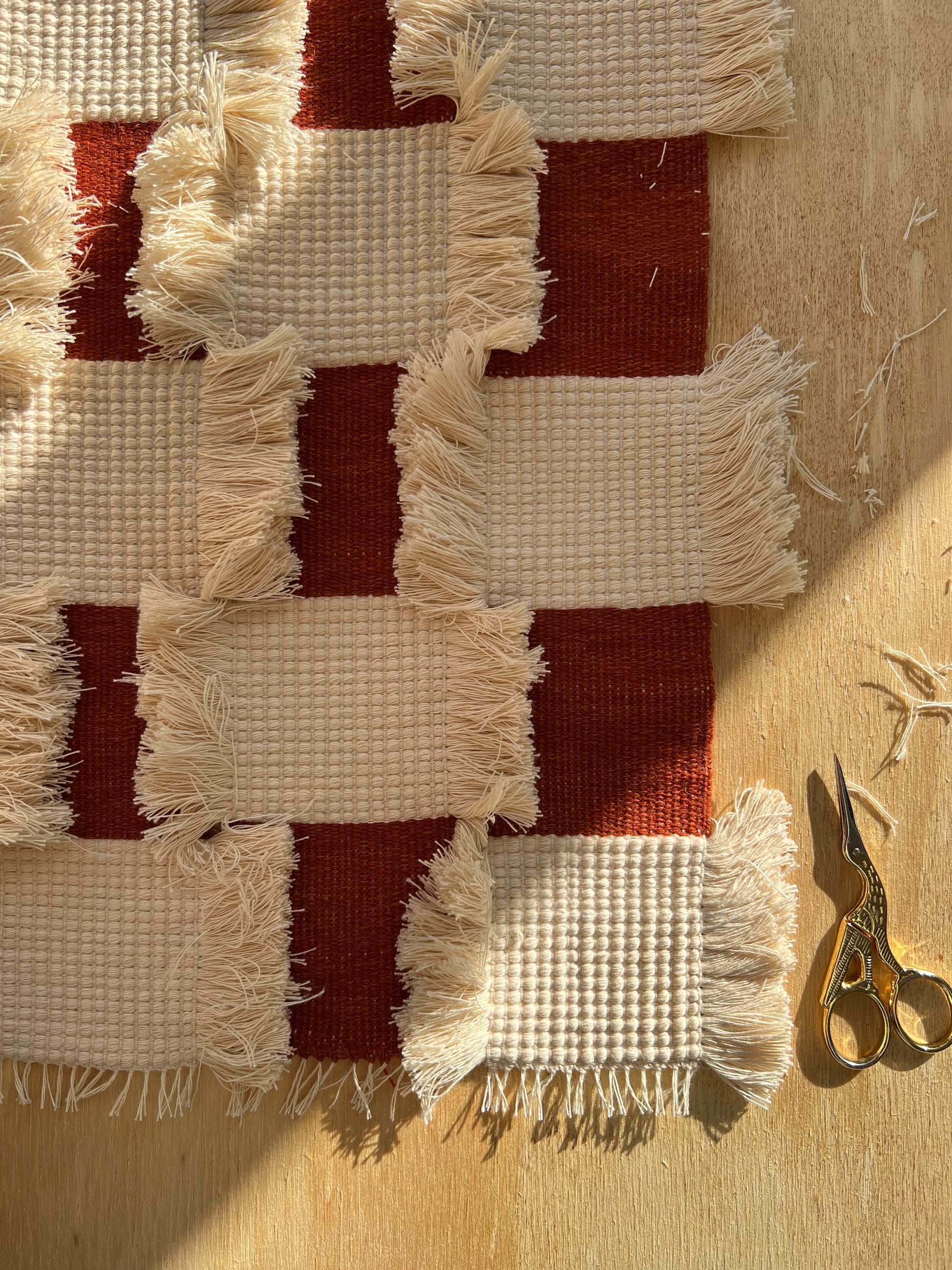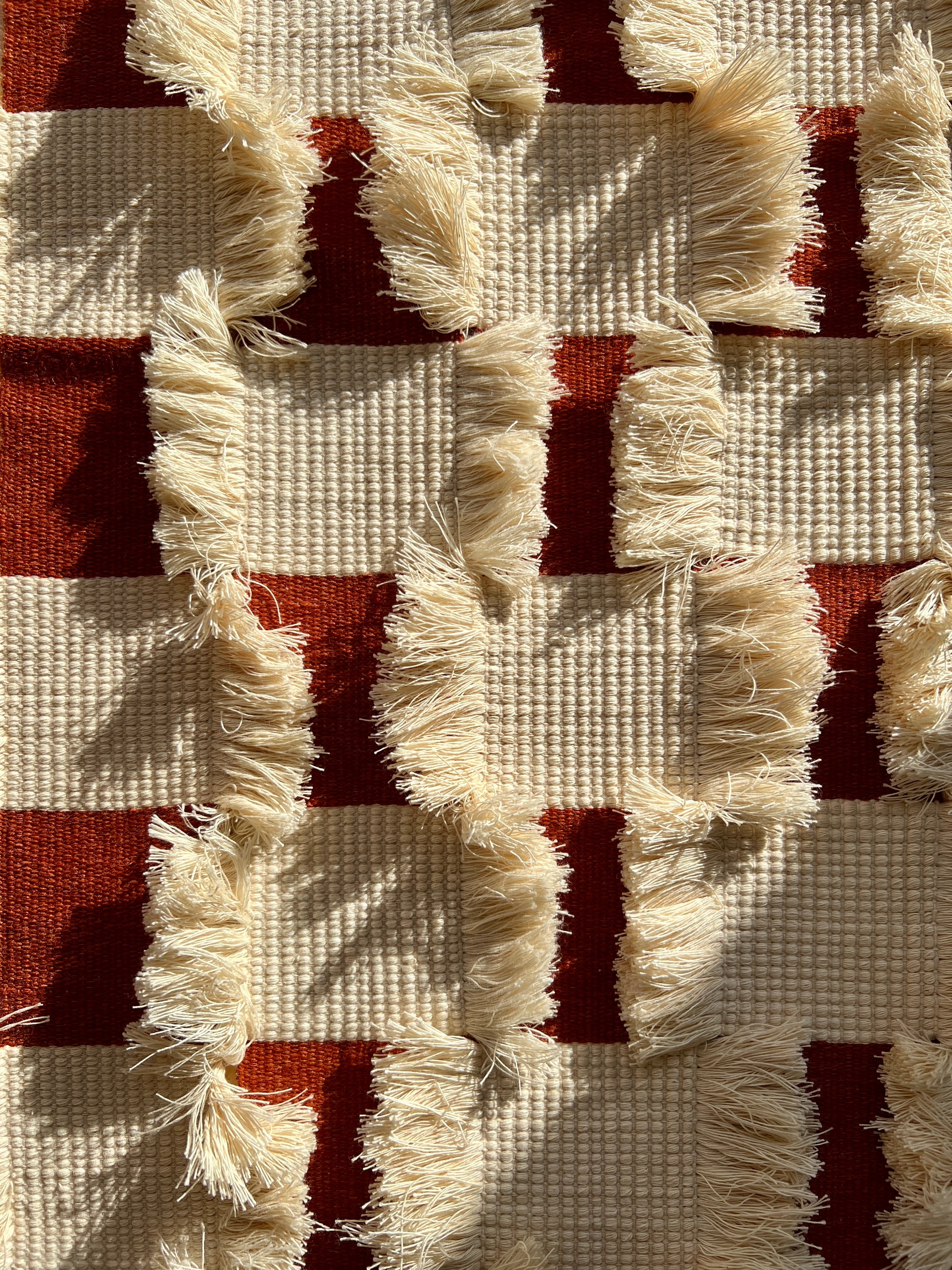 Checkerboard is built from narrow woven panels which I stitched together once they were off the loom, forming a larger cloth - a process which merges my interest in weaving, patchwork and mending. I feel there is a true harmony and balance in my work when I am able to blend all these mediums. For this piece, I used second hand rust coloured linen and the leftover cream cotton thrums from an old warp. I assembled the panels so that the cotton fringe would overlap and obscure some of the linen squares, distorting the checkerboard pattern with rich texture.