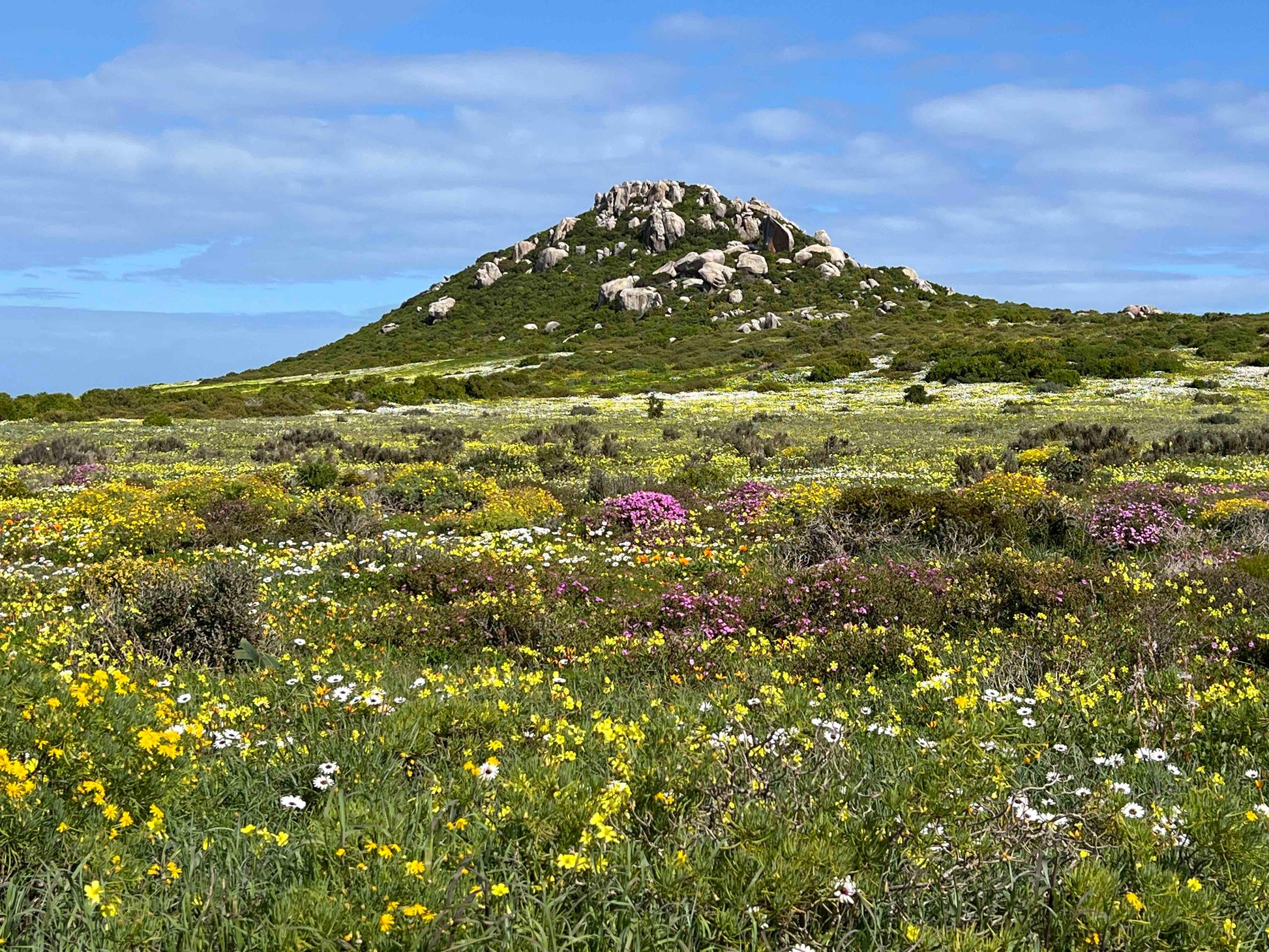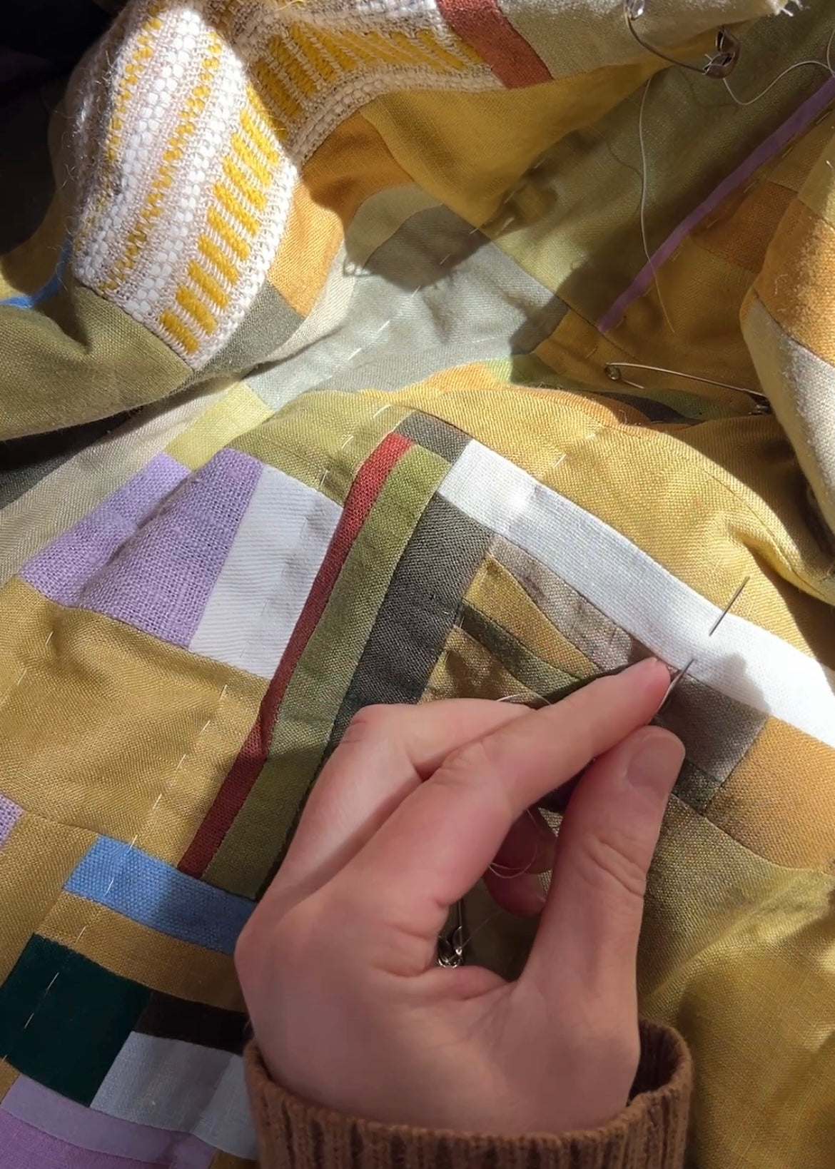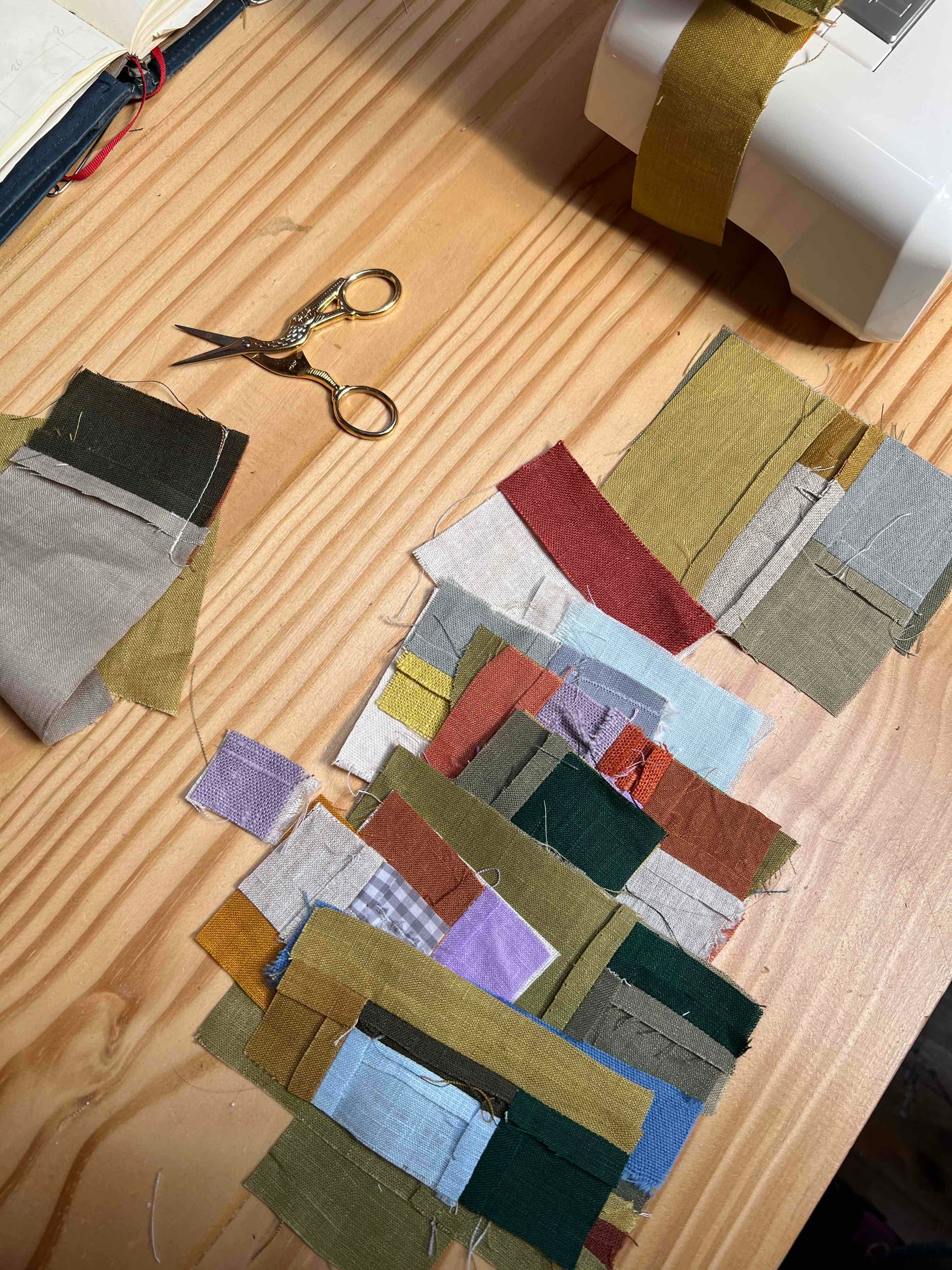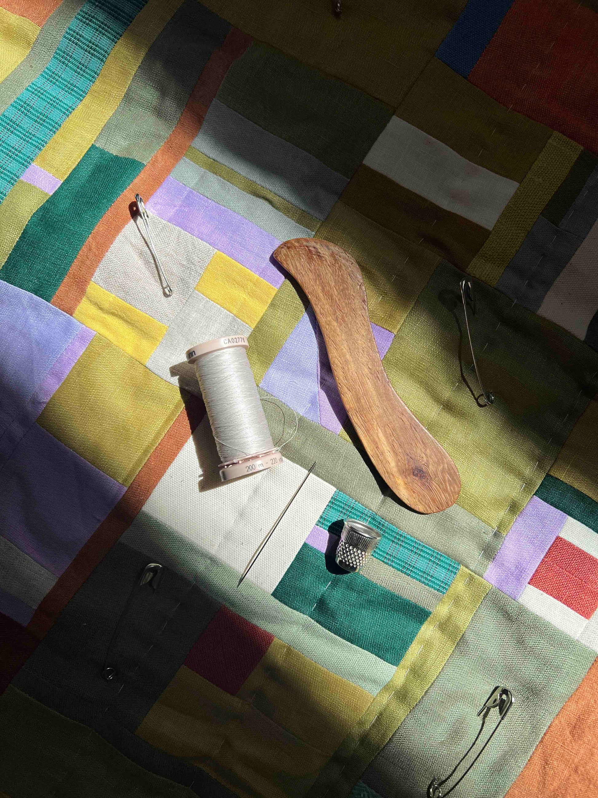 At the end of August, I went up the coast to see the wildflowers in bloom at West Coast National Park - it was the prettiest day, slightly overcast but perfect for photos. There were so many different flowers out and I just couldn’t stop smiling. I came back to the studio that Monday and immediately started sewing a patchwork inspired by the colours, scale and pattern of the flower fields. I decided it would be a small quilt - I finished the quilt top with almost all of my last pieces of yellow and bright green, and used a large piece of blue cotton for the back. The front is machine sewn with 100% cotton thread and made entirely from scraps (mostly linen and cotton, and a few pieces of polyester (the green plaid)). I also included a small piece of my own handwoven fabric for good luck (natural linen and mustard yellow stripes).