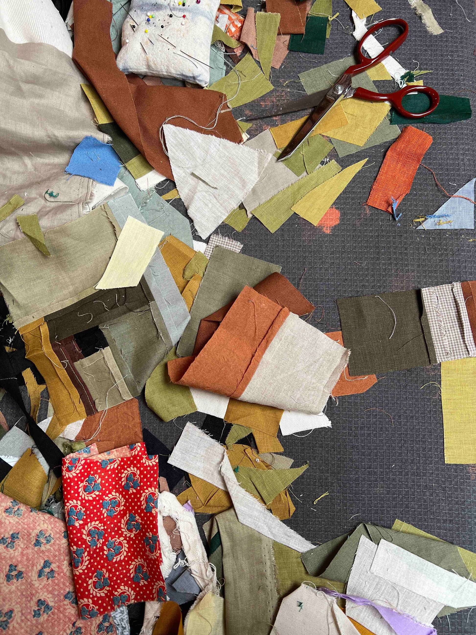 Quilt front: linen, cotton and polyester scraps. Quilt back: 100% cotton