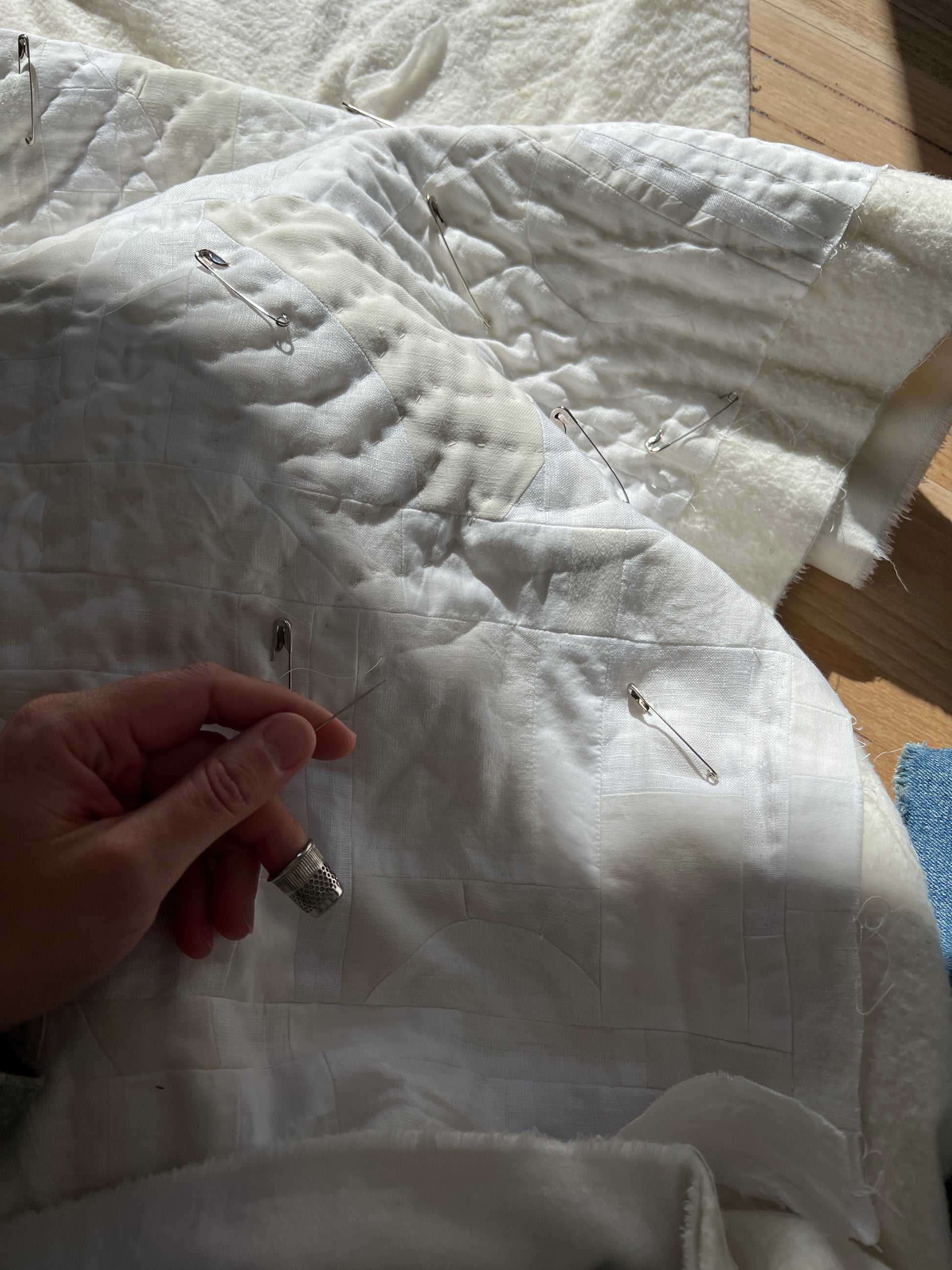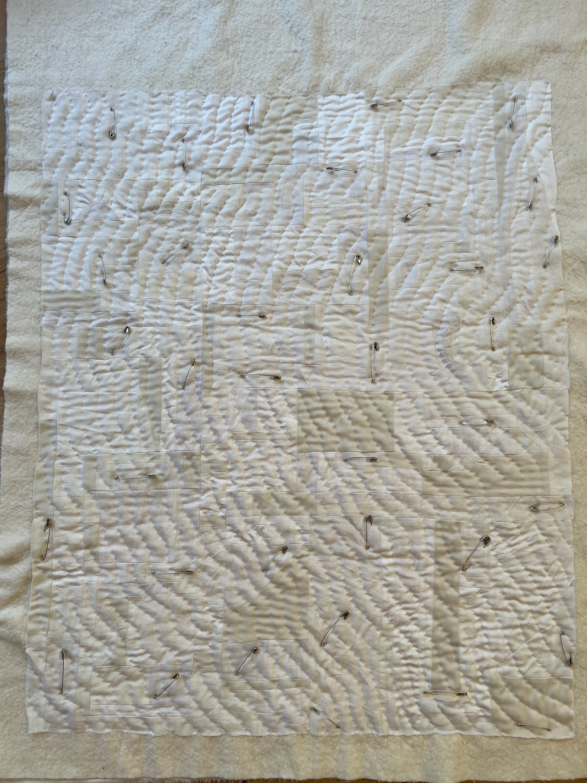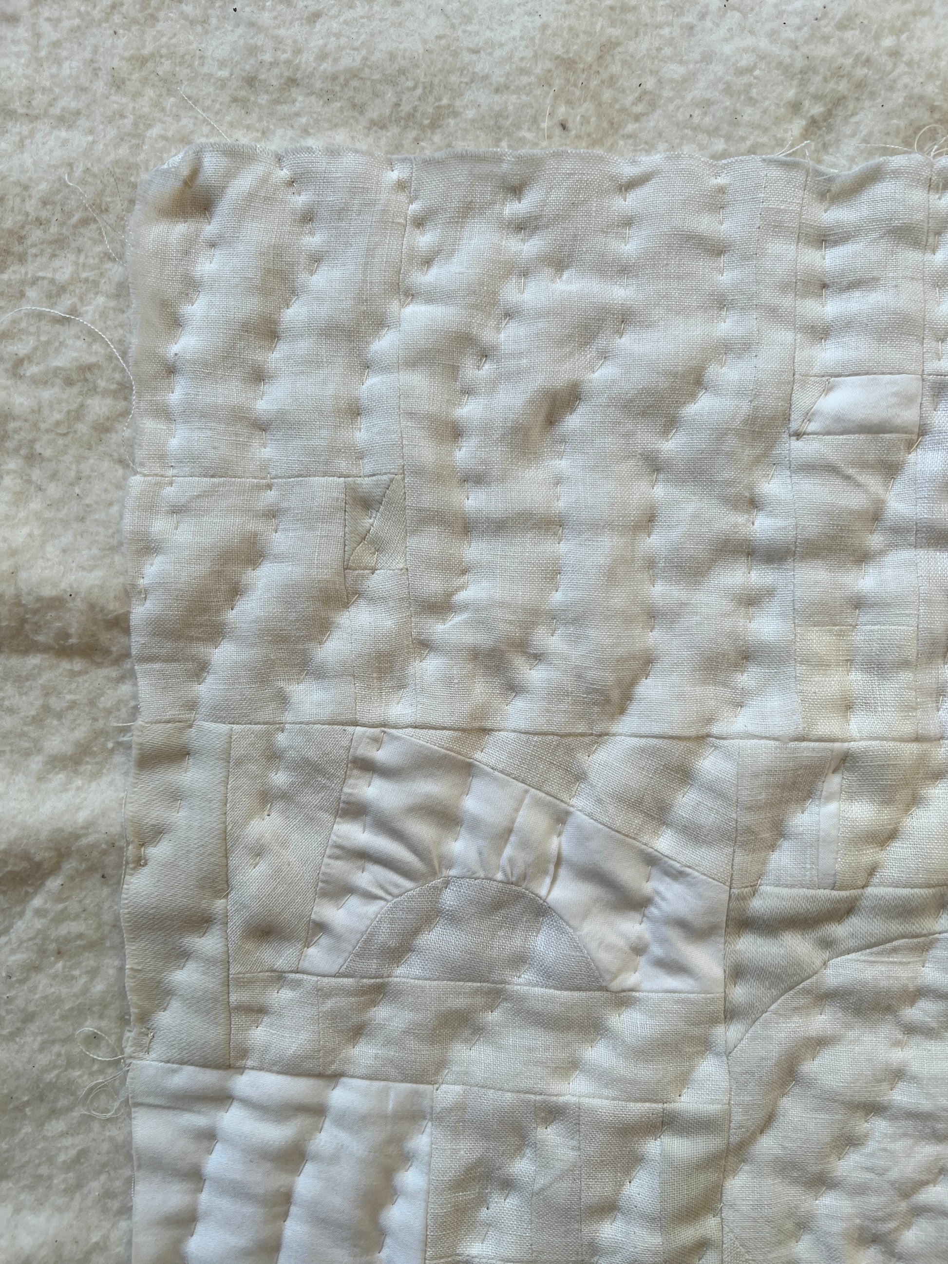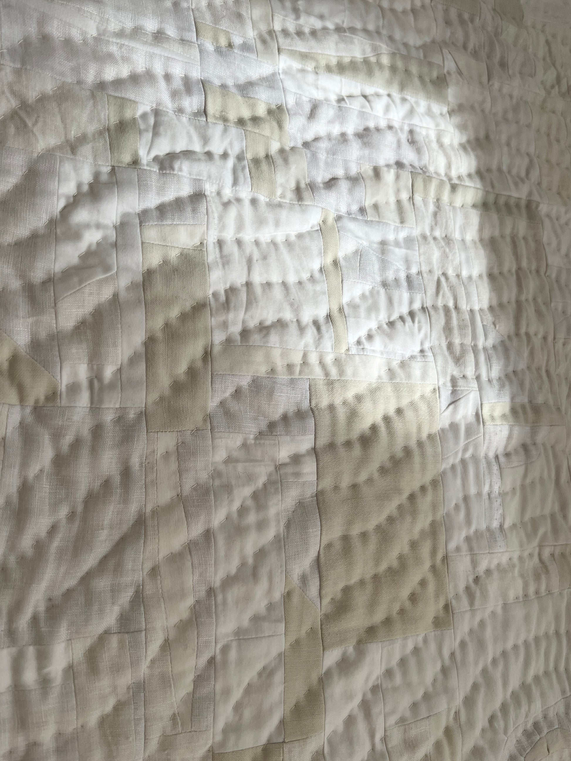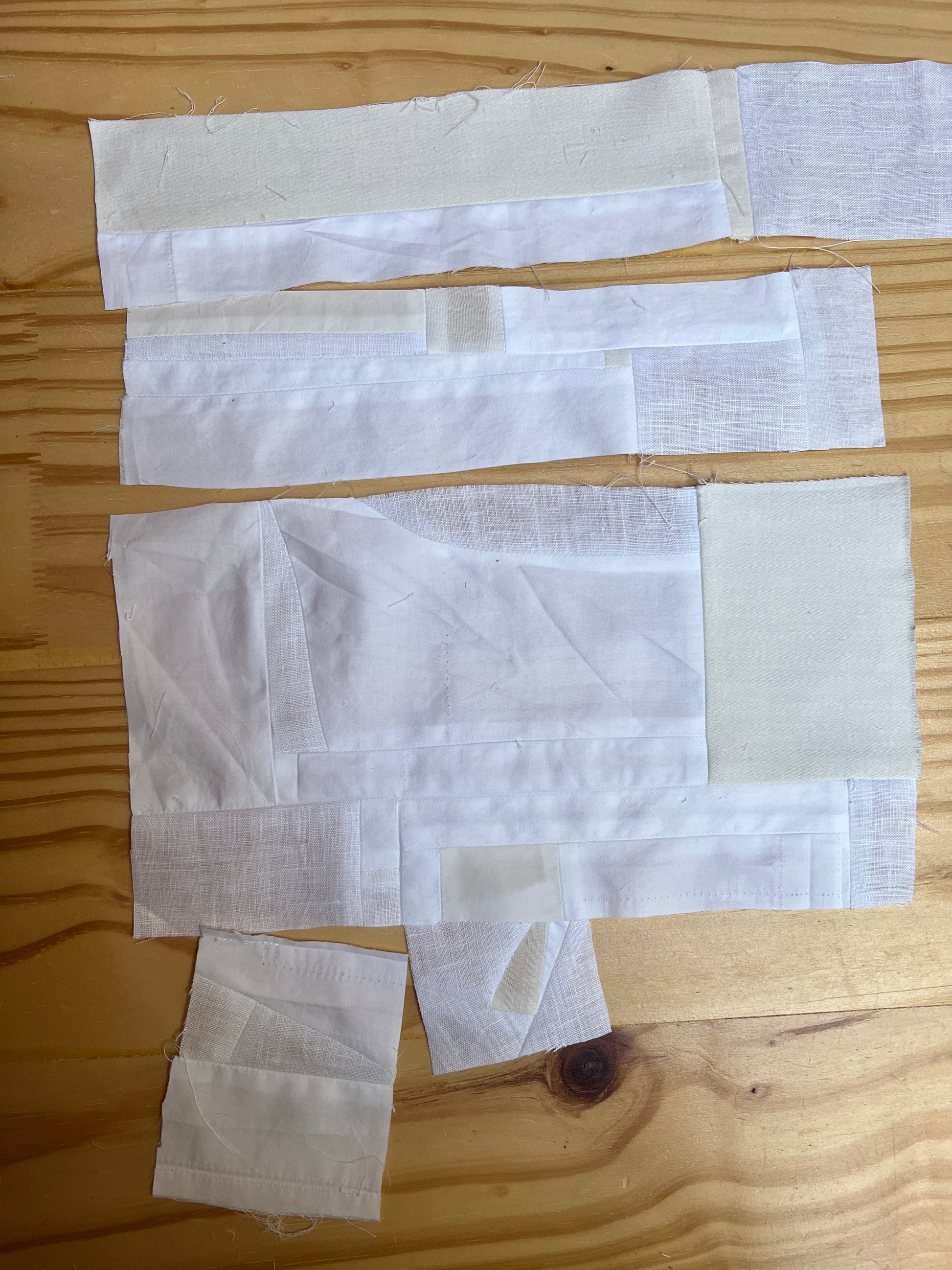 Materials: linen, cotton and polyester scraps; 100% cotton batting, 100% cotton sewing thread