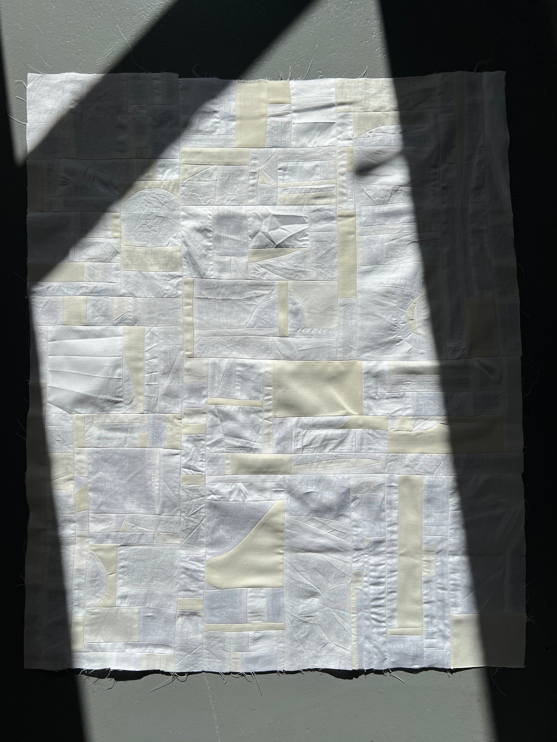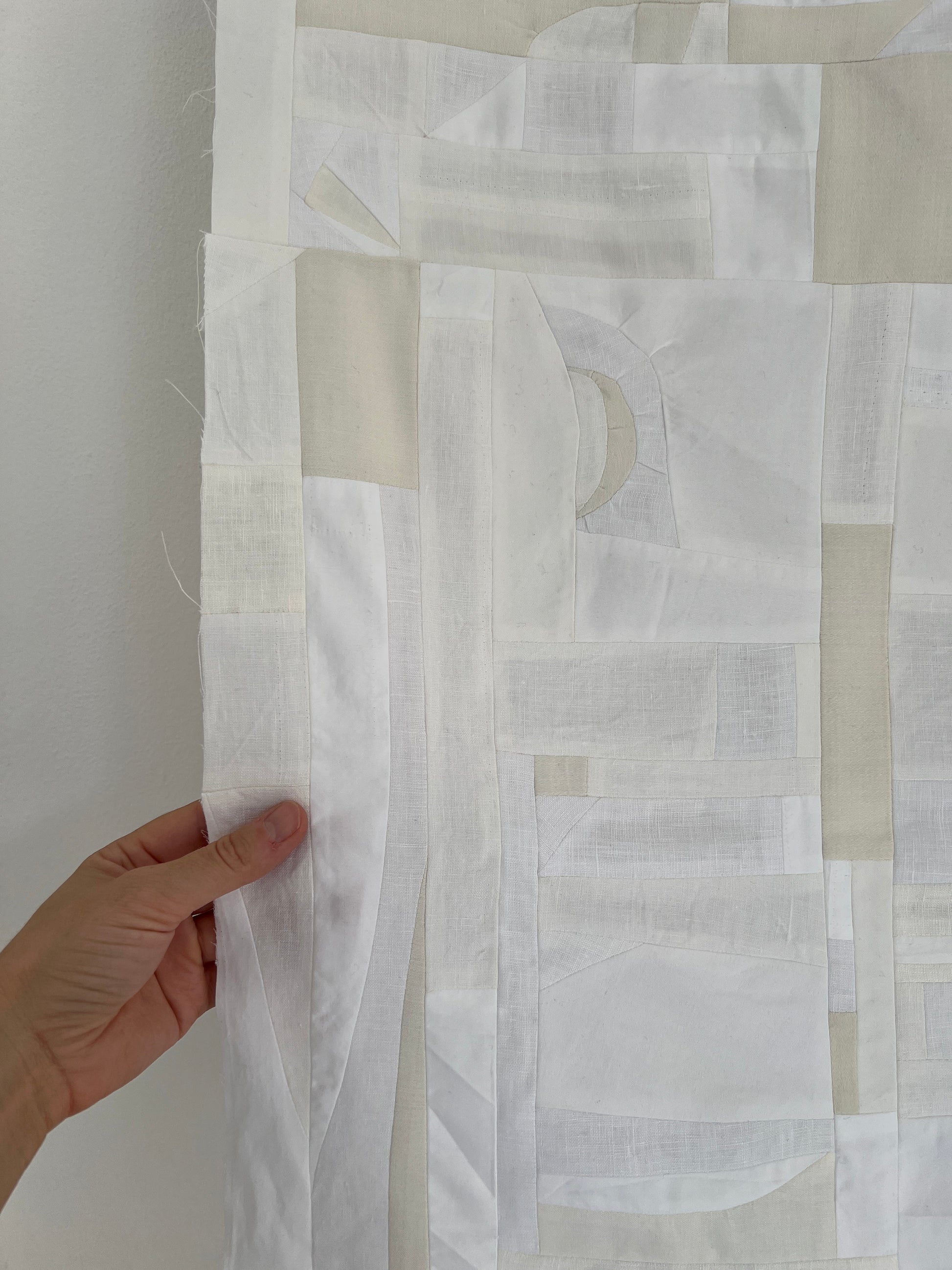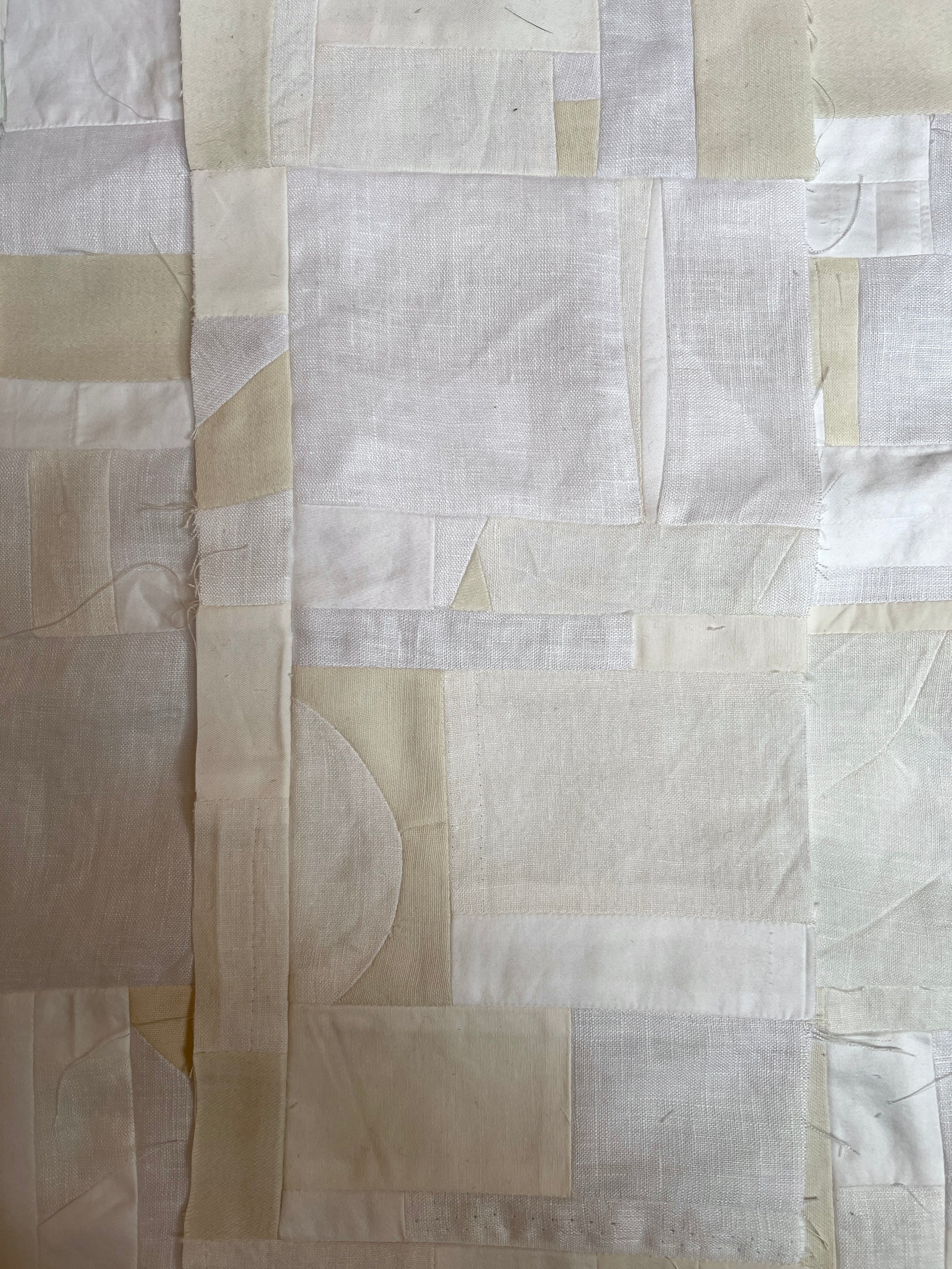 I love how some of the pieces are so small you only really notice them up close, otherwise they disappear into the whole cloth... tiny triangles and squares and random shapes that somehow add up to a larger rectangle.