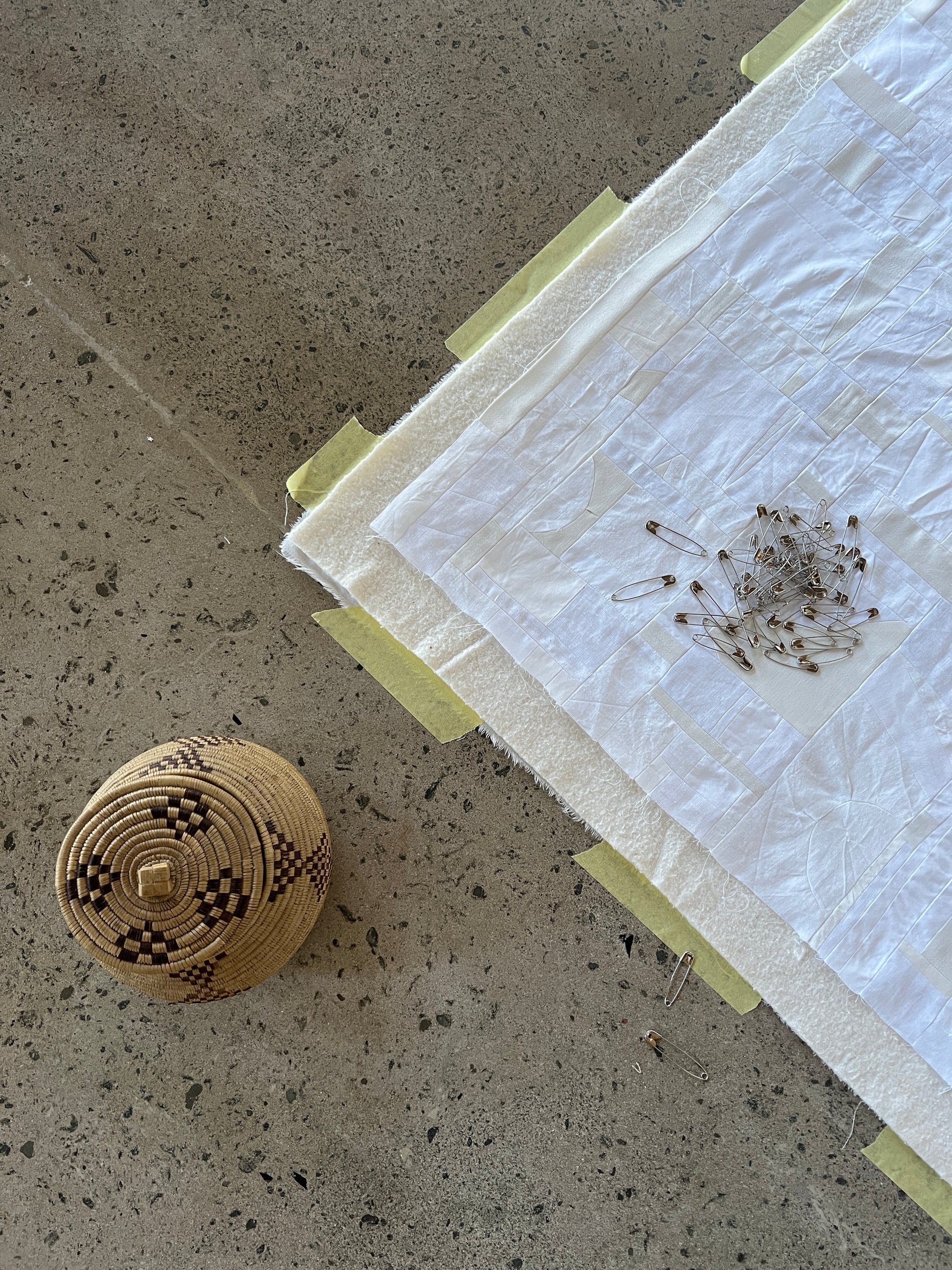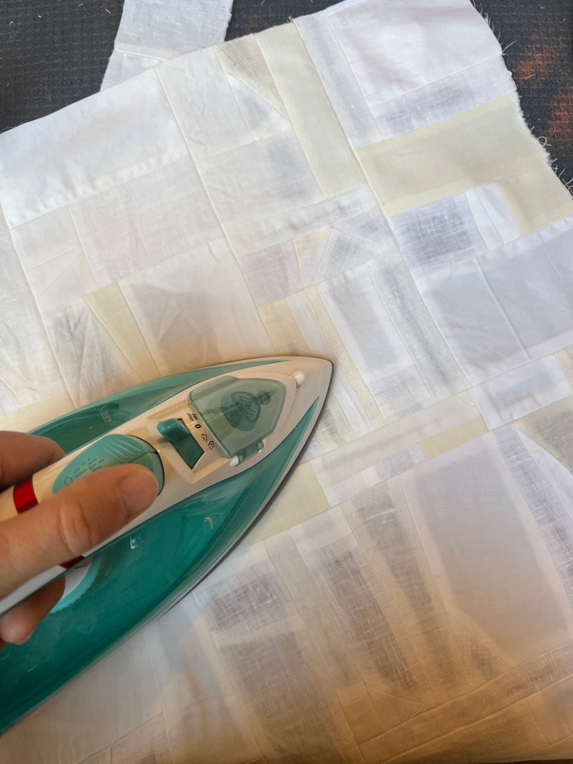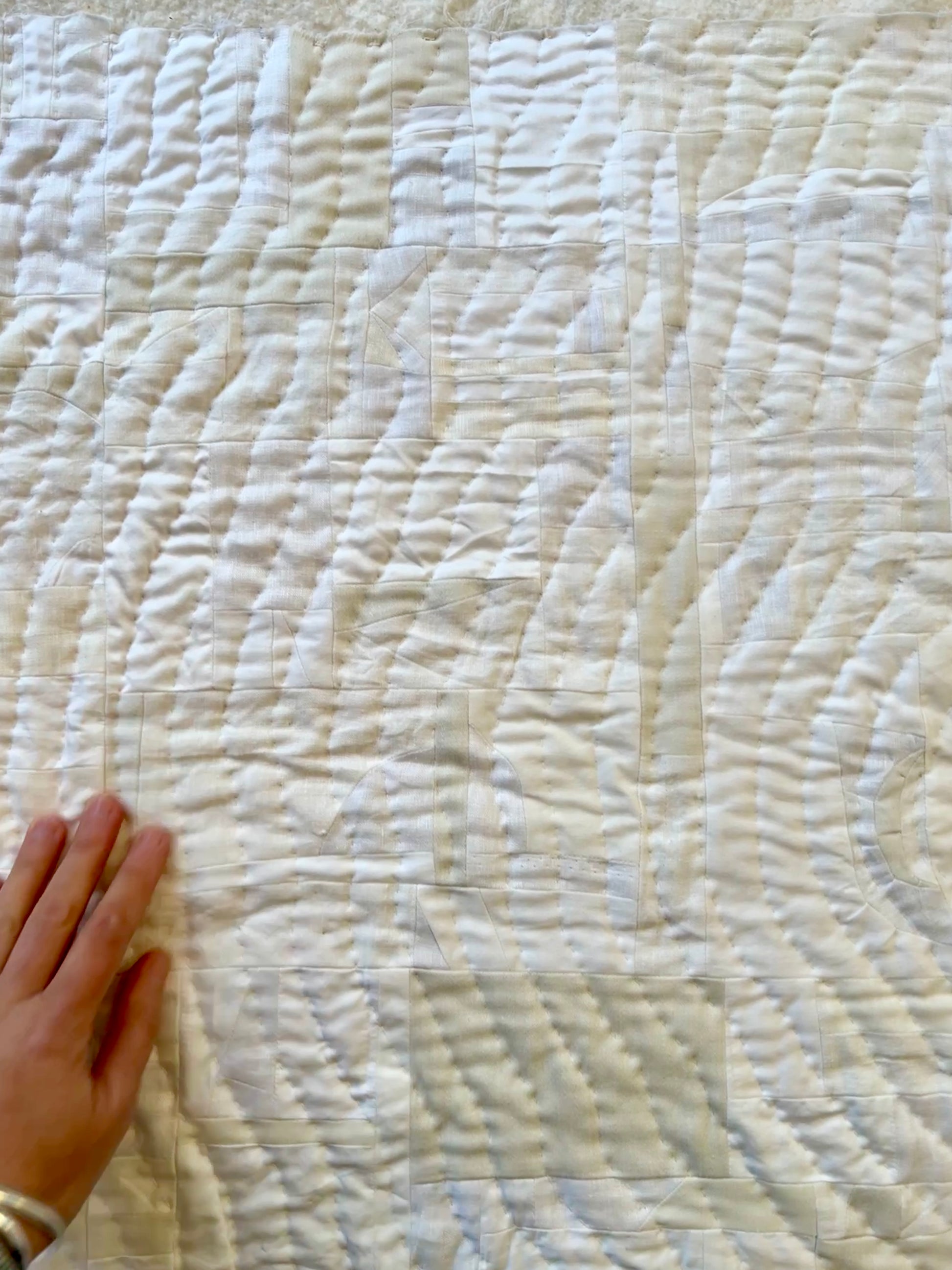 I love how some of the pieces are so small you only really notice them up close, otherwise they disappear into the whole cloth... tiny triangles and squares and random shapes that somehow add up to a larger rectangle.