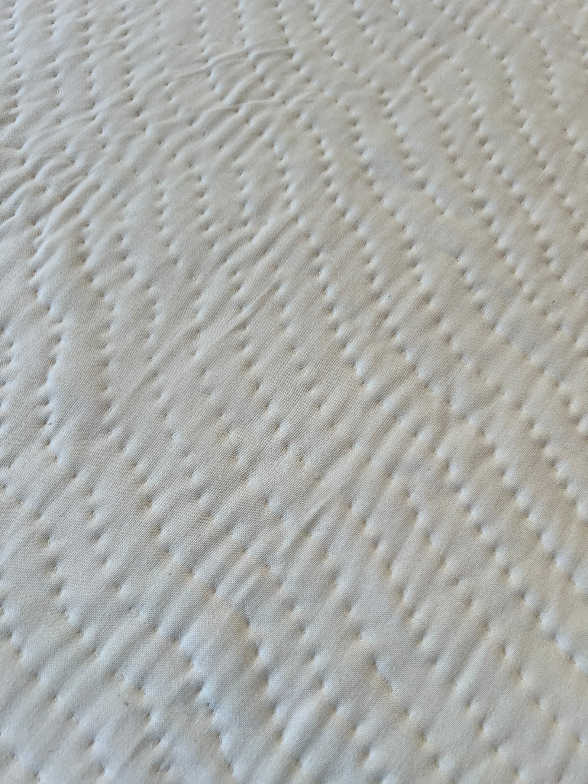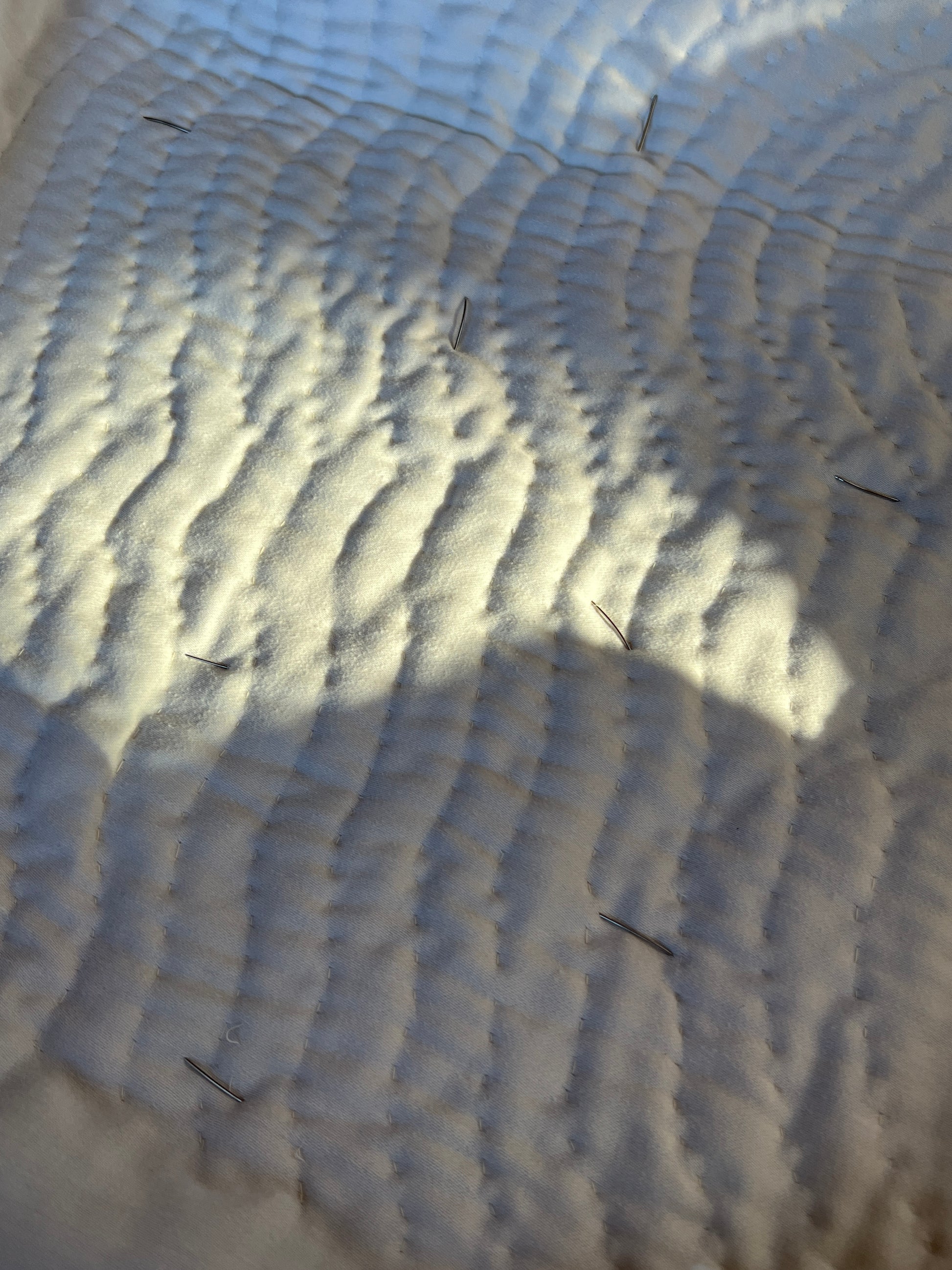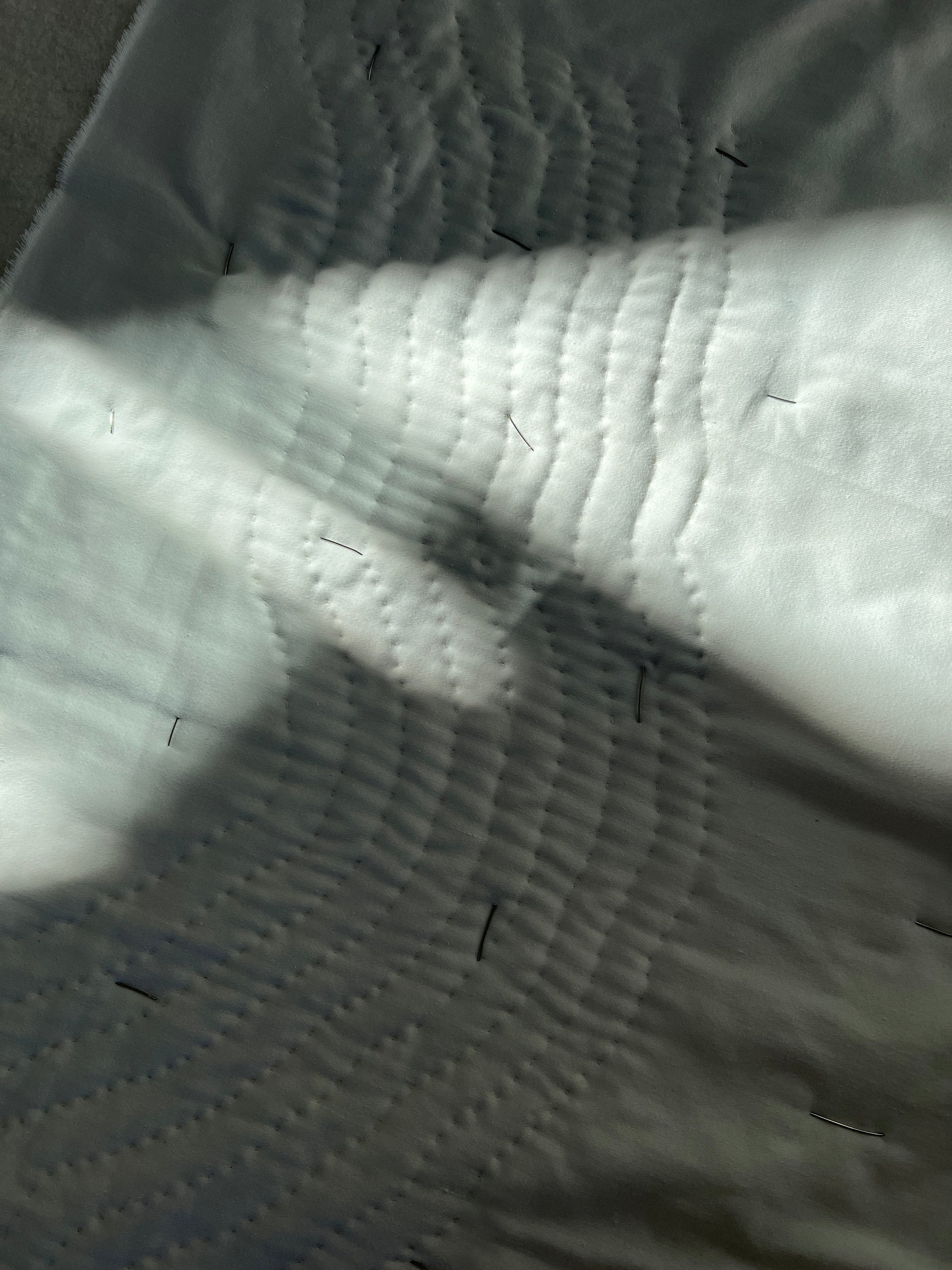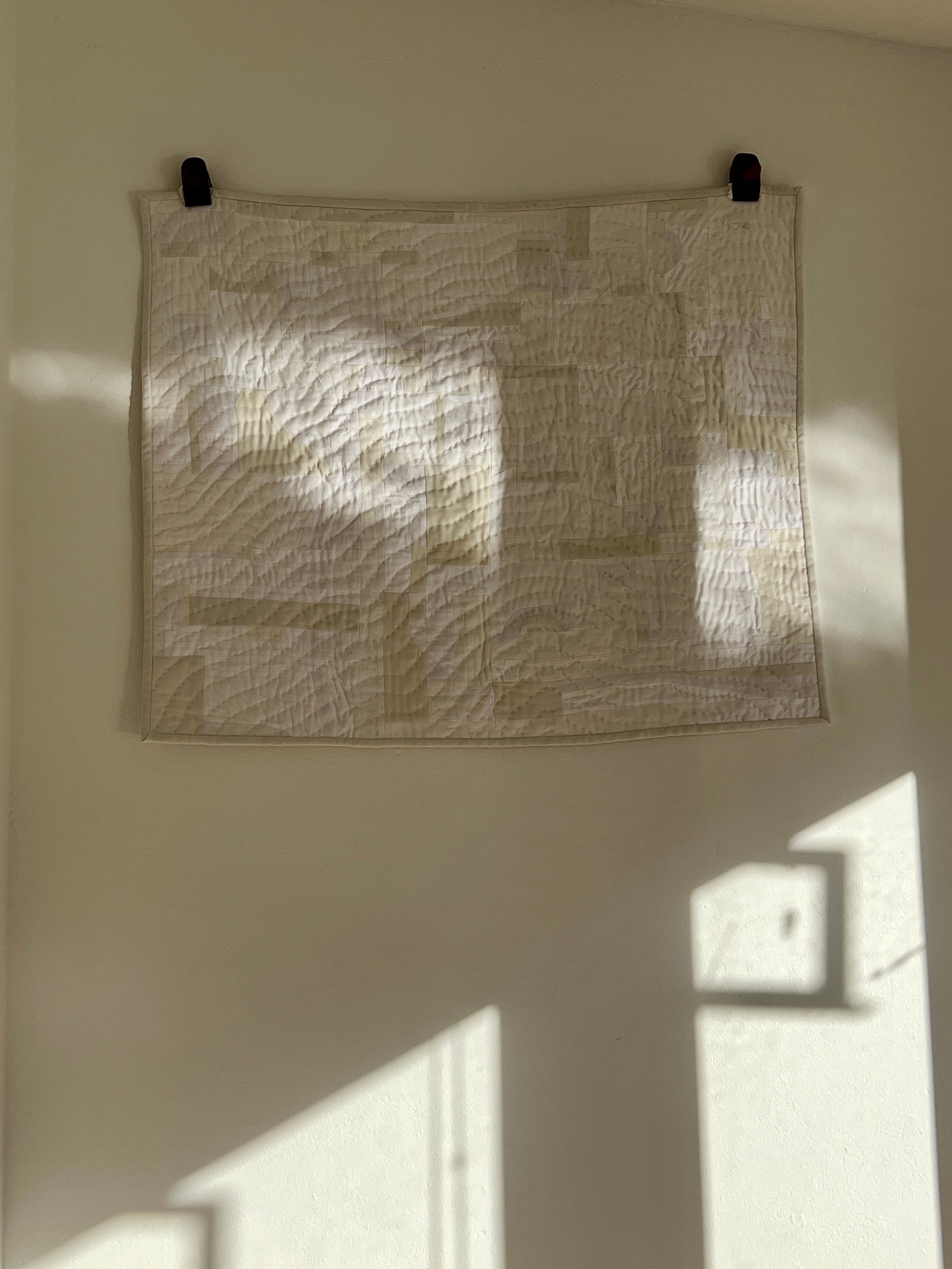 The back is a whole panel made from a curtain that was left in my apartment when I moved in, unwanted and sun stained and dusty. The stitches bring out a new organic movement in the panel, like little ant trails. What was trash is now new again ✨