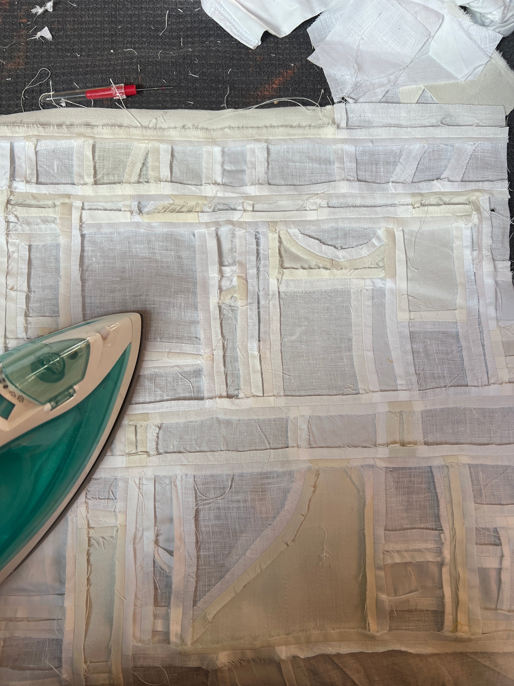 A small quilt made from the scraps leftover from my studio curtains that were also made from scraps.... the bits that I probably shouldn't have saved and yet couldn't bring myself to get rid of.