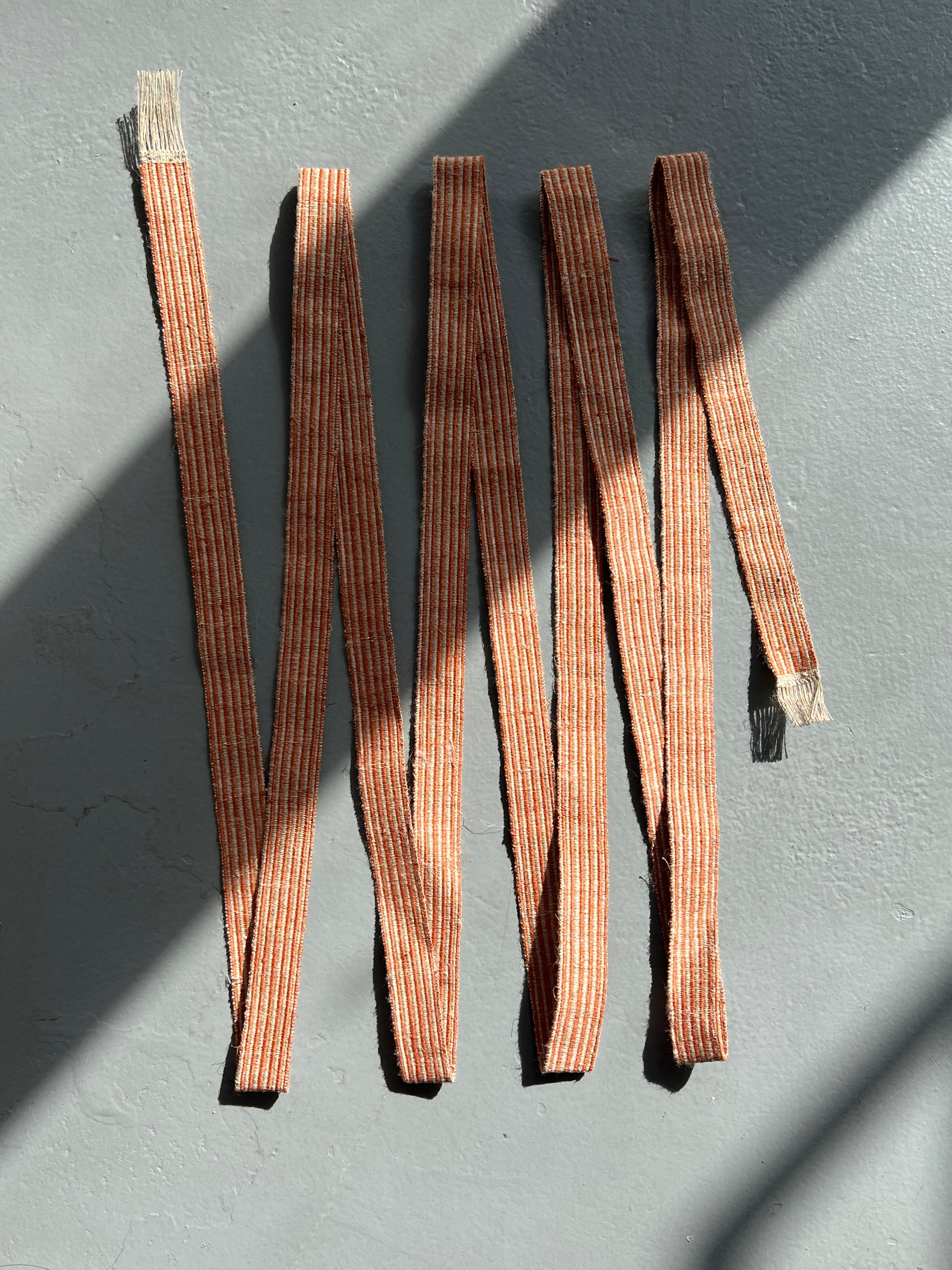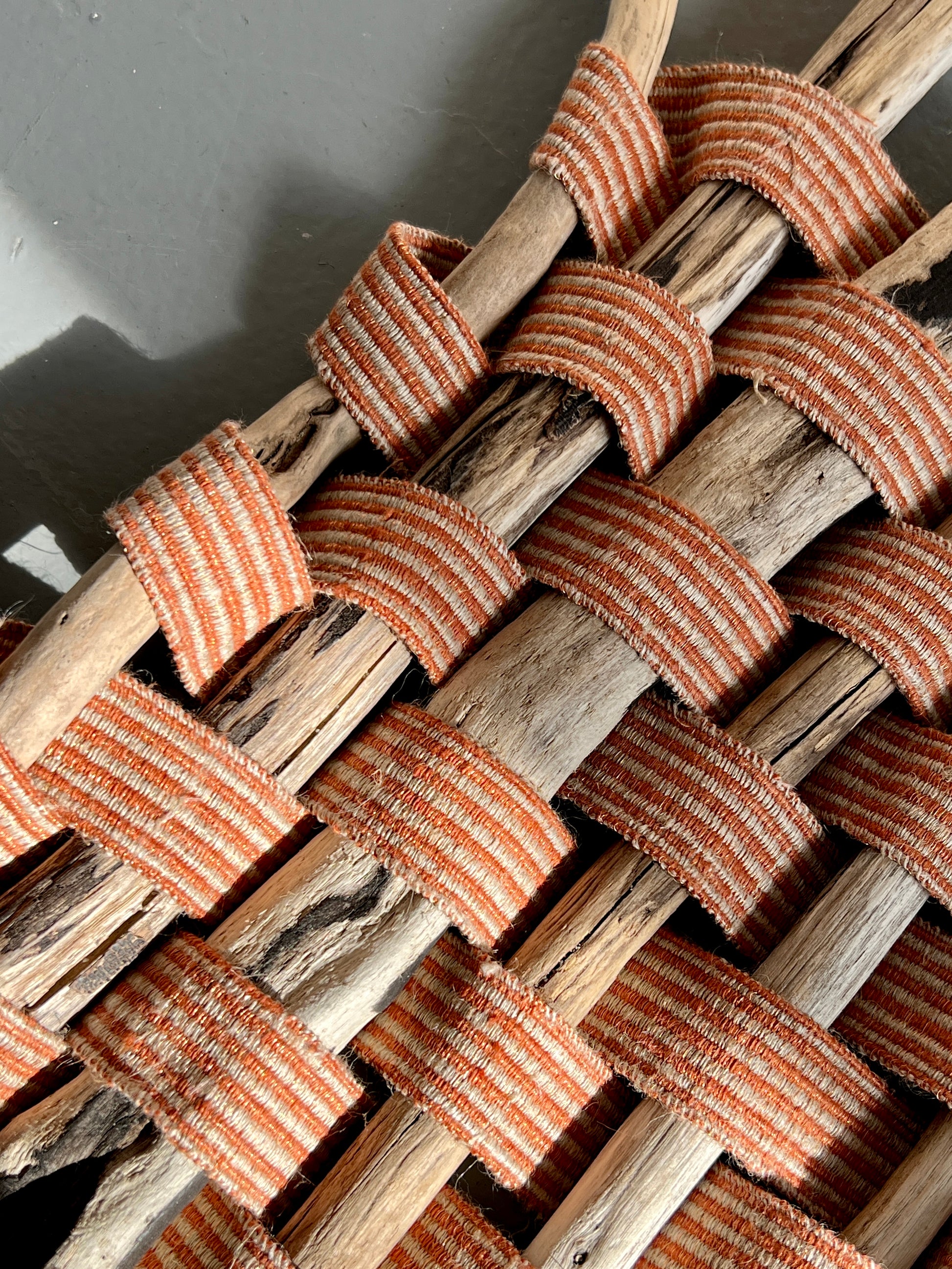 Palmiet Driftwood is a collection of driftwood gathered on the banks of the Palmiet river while on a camping trip. I carefully sorted and organised them before weaving them together with a narrow strip of fabric. I hand wove the strip in one long length of second hand linen and copper (to help give the weave structure to hold everything in place), almost like a ribbon. I love the idea of weaving a narrow piece of fabric and then re weaving it on a larger scale - a lovely mise en abîme.