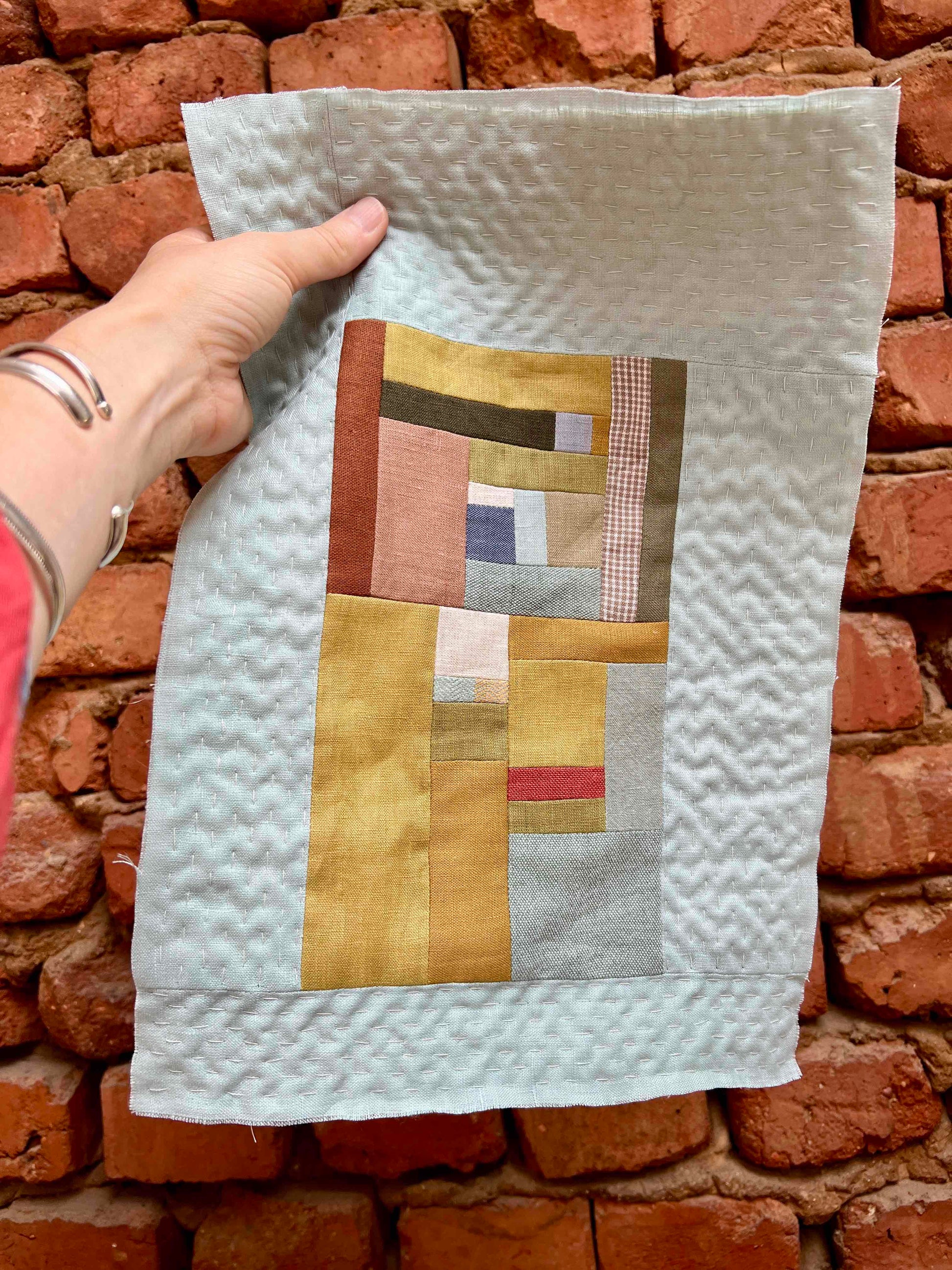 Materials: Linen and cotton fabric scraps, 100% cotton thread and 100% cotton batting