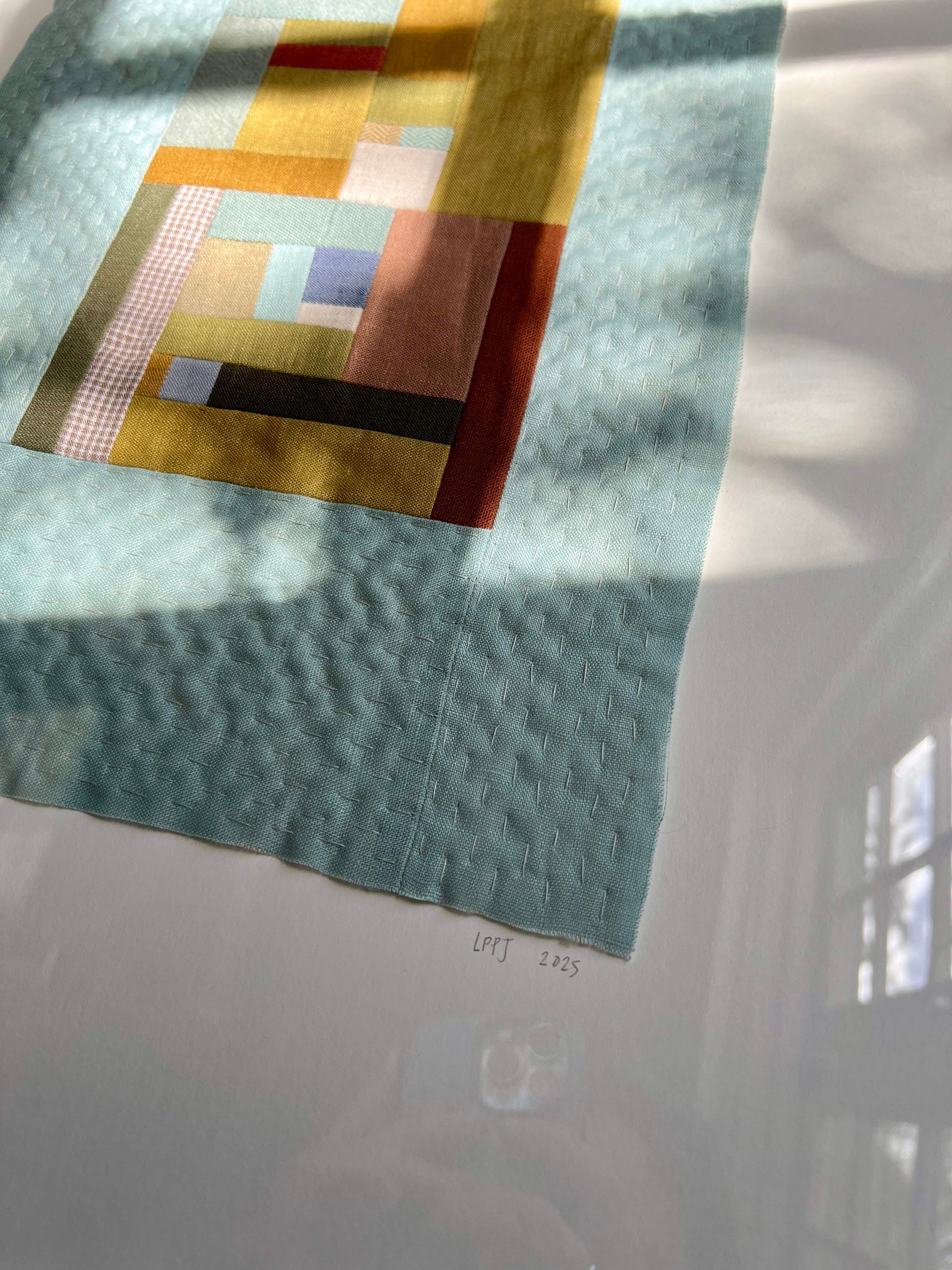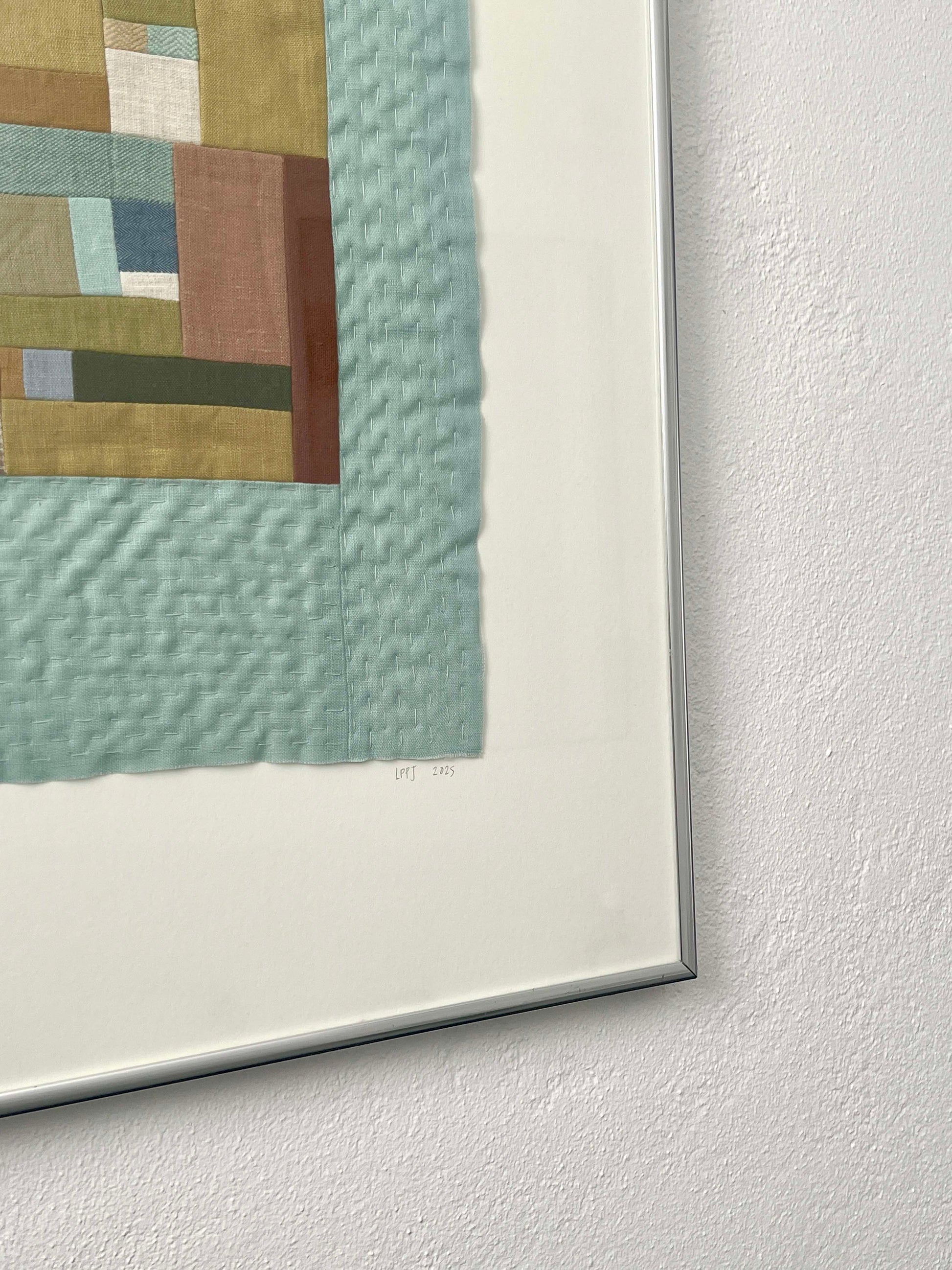 A freeform patchwork made from leftover pieces of my wildflower quilt, in bright greens and warm browns, surrounded by a bright teal border. I assembled them with my sewing machine into a rectangle and hand quilted the finished piece with cotton thread onto cotton batting.