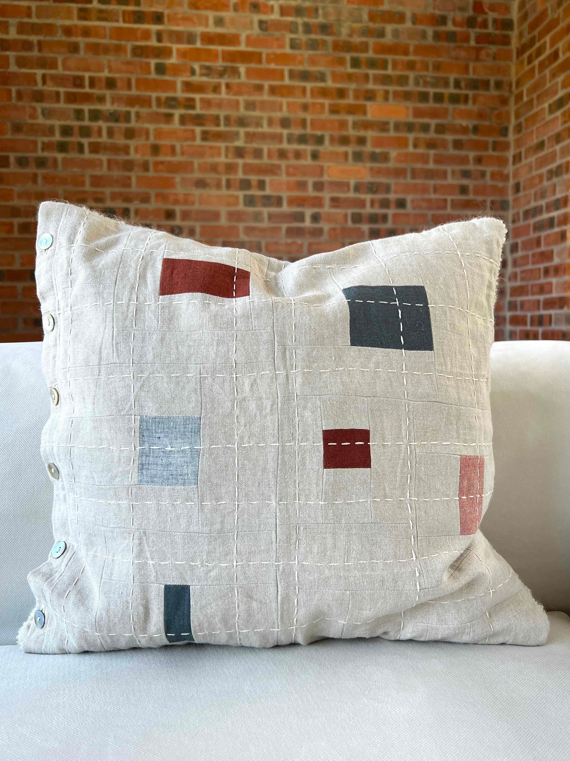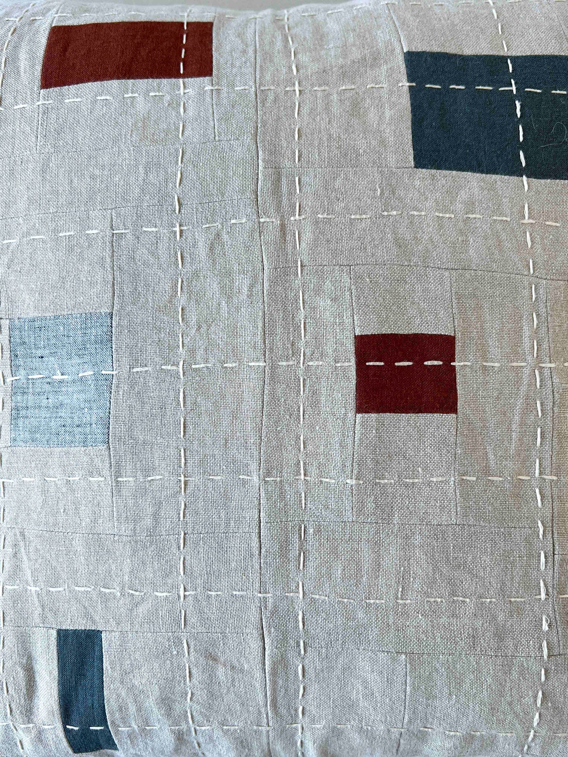 The other side is an almost mirrored image, made from a patchwork of 100% linen offcuts from a local mill. The natural linen colour varies naturally, with some pieces appearing more yellow and others more pink in tone. It is hand quilted onto a 100% cotton backing (made from a repurposed sheet) with cotton sashiko thread.
