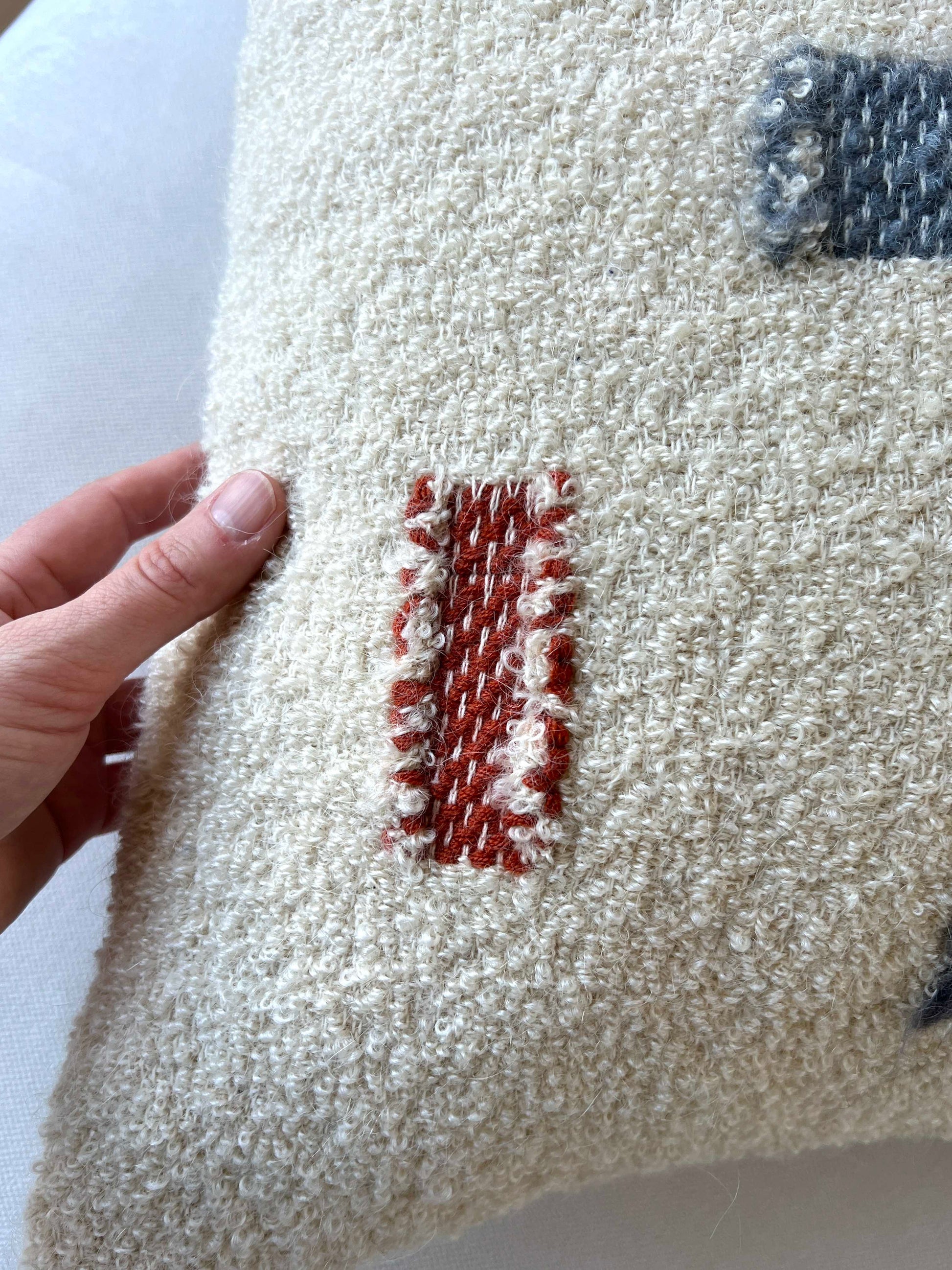 Handwoven 'patchwork' wool cushion with a pieced patchwork back from offcut fabric scraps.
